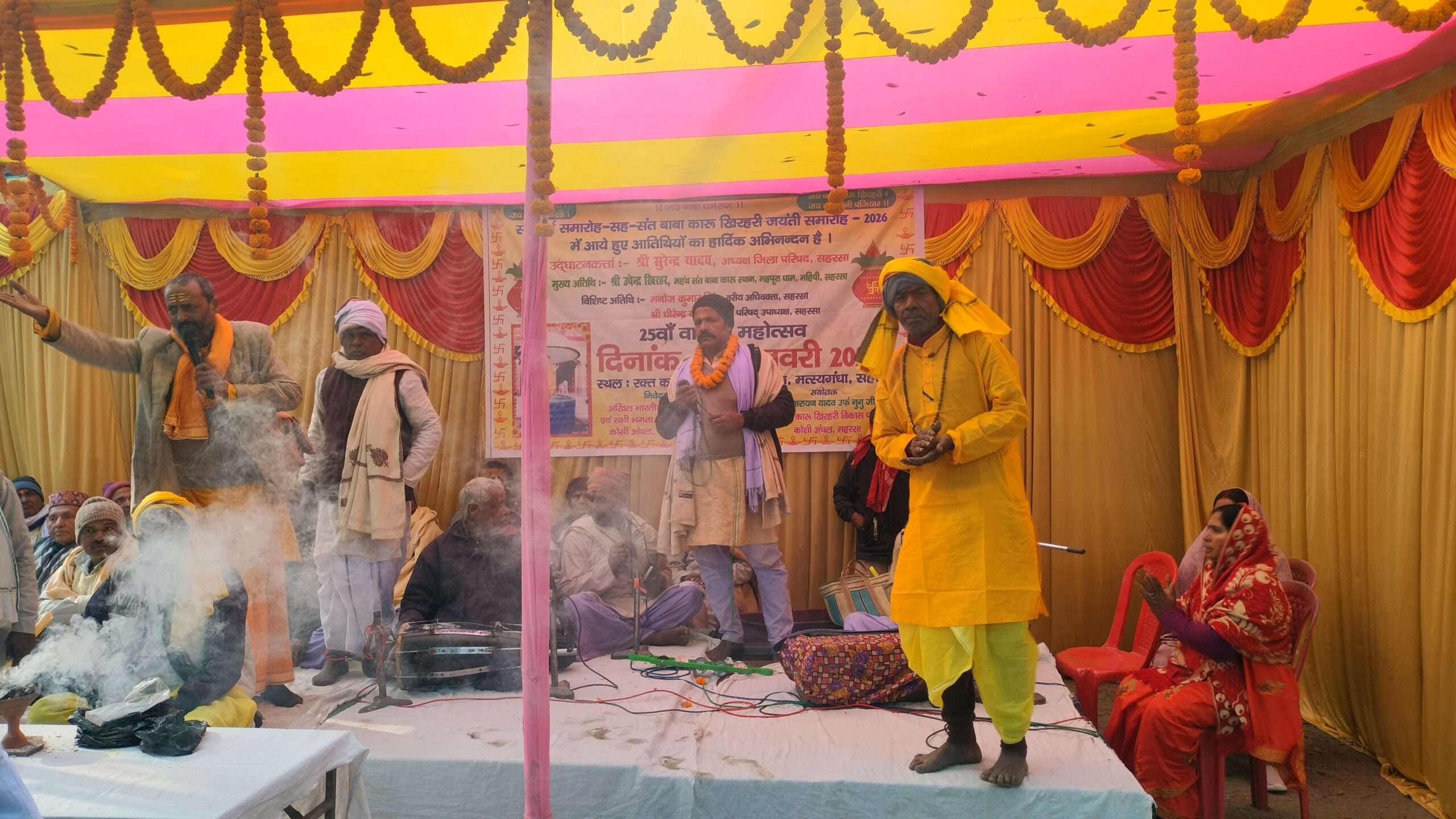 नववर्ष सह बाबा कारू खिरहर जयंती समारोह पर भगैत सम्मेलन का हुआ आयोजन खीर महाप्रसाद का हुआ वितरण सहरसा . हर वर्ष की तरह इस वर्ष भी भगैत महासभा द्वारा अंग्रेजी नववर्ष के अवसर पर भगैत महासम्मेलन का आयोजन किया गया. इस कार्यक्रम का उद्घाटन पूर्व जिप अध्यक्ष सुरेंद्र प्रसाद यादव ने फीता काटकर किया. वहीं मुख्य अतिथि के रूप में कारू बाबा मंदिर के महंथ उपेंद्र खिरहर भी मौजूद रहे. भगैत महासभा के राष्ट्रीय अध्यक्ष देवनारायण यादव ने बताया कि भगैत महासभा सम्मेलन 31 दिसंबर की संध्या से गुरुवार की संध्या तक आयोजित हुई. जिसके बाद खीर महाप्रसाद का वितरण किया गया. उन्होंने कहा कि कारू खिरहर महान सिद्ध साधक संत थे. जिन्होंने अपनी तपस्या की बल पर भगवान भोलेनाथ से साक्षात्कार कर प्रसिद्धि पायी. वे जीवन पर्यंत पशुओं की सेवा करते रहे. जिसके कारण उन्हें लोक देवता के रूप में आज भी पूजा जाता है. उनके स्मरण मात्र से मवेशी रोगमुक्त हो जाते हैं. भगैत महासभा के पर्यवेक्षक अशोक मानव ने कहा कि इस भगैत महासम्मेलन में खजूरी से रामनारायण सभापति, सपटियाही से ललन पंजियार, भजन पट्टी से विलास पंजियार, नंदलाली से विष्णु देव सभापति, बटराहा से कमल योगेंद्र पंजियार, बनमा इटहरी से फौद्दार पंजियार, बेंगहा से गणेश पंजियार, मोहनपुर से सोनेलाल भगत, दास टोला बेंगहा से धरमू पंजियार, कमलपुर से जोगेंद्र सभापति सहित अन्य भक्त मंडली ने सुमधुर गायन किया. अशोक मानव ने कहा कि विगत 11 एवं 12 जनवरी को कारू खिरहर हाॅल्ट स्थापना दिवस के अवसर पर भव्य भगैत महासम्मेलन का आयोजन किया जायेगा. इस मौके पर कोषाध्यक्ष अशोक यादव, दीपेन पंजियार, रंजीत पंजियार, अनिल कुमार, उमेश कुमार, पप्पू कुमार सहित अन्य मौजूद थे.
