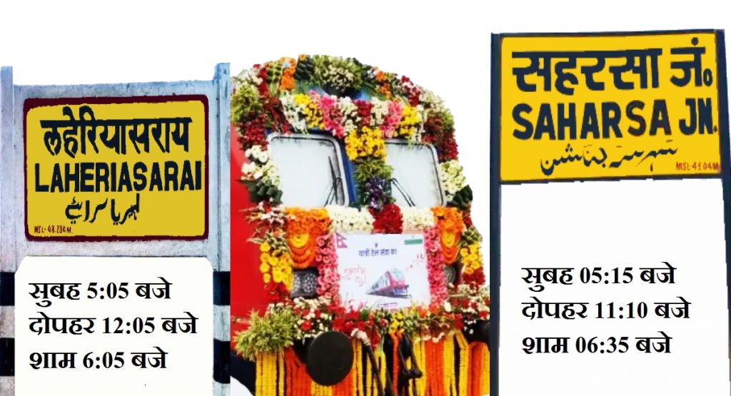 गाड़ी संख्या 05548 सहरसा-लहेरियासराय डेमू स्पेशल सहरसा से 11:10 बजे खुलकर 11:54 बजे सुपौल, 12:50 बजे सरायगढ़, 13:25 बजे निर्मली, 14:18 बजे झंझारपुर, 15:12 बजे सकरी, 16:55 बजे दरभंगा रुकते हुए 17:15 बजे लहेरियासराय पहुंचेगी. गाड़ी संख्या 05546 सहरसा-लहेरियासराय डेमू स्पेशल सहरसा से 18:35 बजे खुलकर 19:21 बजे सुपौल, 20:42 बजे सरायगढ़, 21:19 बजे निर्मली, 22:13 बजे झंझारपुर, 22:46 बजे सकरी, 23:30 बजे दरभंगा रुकते हुए 23.55 बजे लहेरियासराय पहुंचेगी.