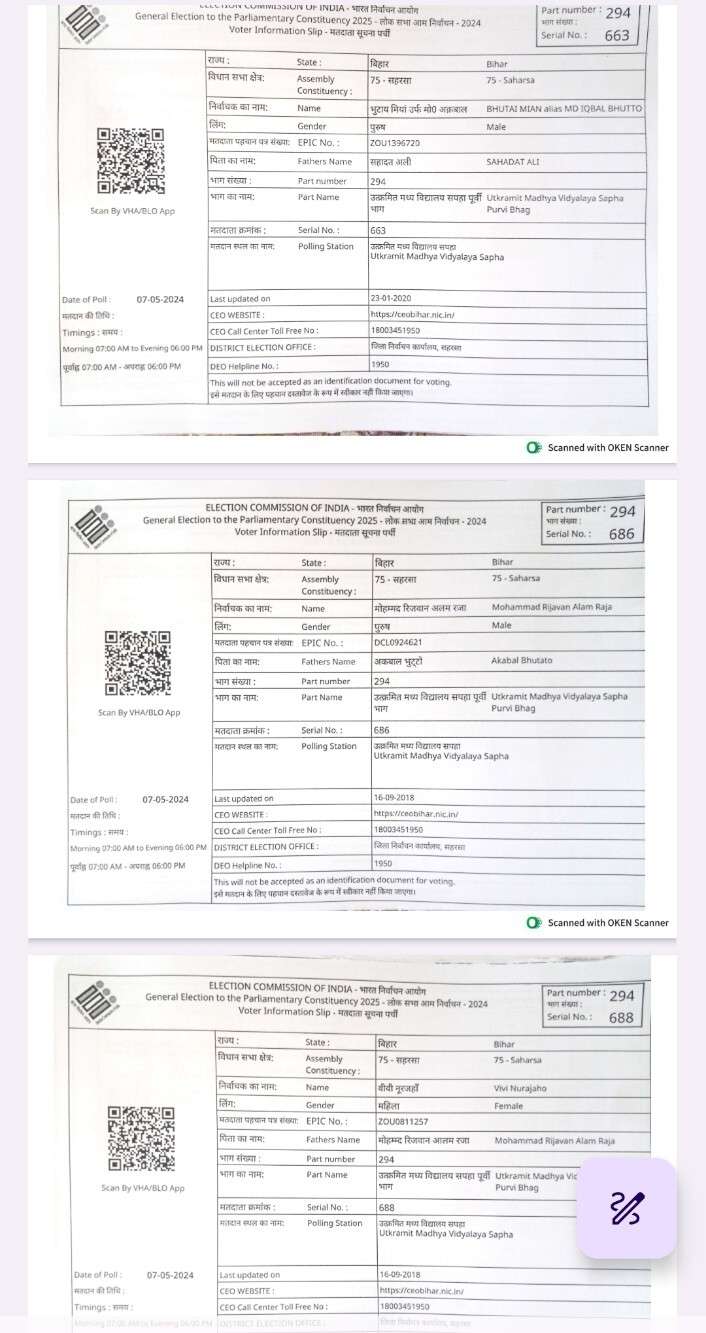 Saharsa vidhansabha 2025: सौरबाजार . बिहार विधानसभा चुनाव को लेकर बीएलओ द्वारा मतदाताओं को घर-घर मतदाता पर्ची पहुंचायी जा रही है. सहरसा विधानसभा में पहले चरण में 6 नवंबर को चुनाव होना है. लेकिन खजुरी पंचायत के सपहा गांव में बूथ संख्या 294 पर बीएलओ द्वारा बांटे गए मतदाता पर्ची में मतदान की तिथि 7 मई 2024 लिखी हुई है. जिसके कारण मतदाता असमंजस की स्थिति में है. सपहा गांव निवासी सहरसा जिला समाहरणालय प्रधान लिपिक पद से सेवानिवृत्त हुए मोहम्मद अकबाल भुट्टो, रिजवान आलम, बेगम परवीन, बीबी नूरजहां, रियाज आलम समेत दर्जनों लोगों को मिले मतदाता पर्ची पर मतदान की तिथि 7 मई 2024 लिखे रहने से सभी लोग असमंजस में है कि आखिर चुनाव आयोग जो समय बीत गया है, उस समय का पर्ची क्यों बंटवा रहा है. हमलोग कब वोट डालने जायेंगे. मामले में सौरबाजार प्रखंड विकास पदाधिकारी आशा कुमारी ने बताया कि जानकारी ली जा रही है. कैसे और कहां से गलती हुई है.