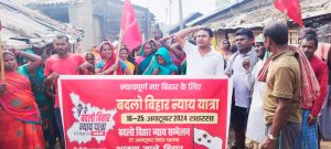 निकाली गयी बदलो बिहार न्याय यात्रा सत्तरकटैया . भाकपा माले के नेतृत्व में पूरे बिहार में चल रहे बदलो बिहार न्याय यात्रा शुक्रवार को सत्तरकटैया प्रखंड अंतर्गत रकिया पंचायत में भी निकाली गयी. रकिया पंचायत के छतराही से निकली न्याय यात्रा विभिन्न टोलों का भ्रमण किया और जनविरोधी जदयू-भाजपा सरकार के खिलाफ जमकर नारेबाजी की. यात्रा माले नेता बमभोली सादा के नेतृत्व में निकाली गयी. जिसमें पार्टी के दर्जनों महिला व पुरुष समर्थक शामिल थे. इस यात्रा के माध्यम से पार्टी ने अति निर्धन परिवारों को मुख्यमंत्री द्वारा घोषित 2-2 लाख रुपये देने, दलित, गरीबों, महिलाओं और अल्पसंख्यकों पर जारी सामंती हिंसा पर रोक लगाने, भूमिहीनों के लिए आवासीय जमीन व पक्का मकान देने, स्मार्ट मीटर पर रोक लगाने, सभी लोगों के जमीन के कागजात दुरुस्त नहीं होने तक सर्वे पर रोक, स्कीम वर्कर के लिए न्यूनतम मजदूरी, बाढ़–सुखाड़ का स्थायी निदान करने, आरक्षण वृद्धि को 9वीं अनुसूची में शामिल करने, विशेष राज्य का दर्जा देने का मुद्दों उठाया जा रहा है. बदलो बिहार न्याय यात्रा को संबोधित करते हुए युवा नेता कुंदन यादव ने कहा कि यह यात्रा न्यायपूर्ण नये बिहार के निर्माण के लिए है. केंद्र की मोदी सरकार की तरह बिहार में भी जदयू-भाजपा सरकार को जनता के सवालों से कोई लेना-देना देना नहीं है. जनहित से जुड़े कल्याणकारी योजना में लूट मची हुई है. भ्रष्टाचार व अफसरशाही चरम पर है. उन्होंने कहा स्मार्ट मीटर उपभोक्ताओं का खून चूसने वाला मीटर है. इसका विरोध शहर से लेकर गांव-गांव तक हो रहा है. लेकिन सरकार चुप है. उन्होंने पार्टी कार्यकर्त्ताओं से 27 अक्तूबर को पटना में बदलो बिहार न्याय सम्मेलन में भारी संख्या में भाग लेने की अपील की. मौके पर माले युवा नेता सागर कुमार शर्मा, मो जमीर आलम, महिला नेत्री संजू कुमारी, सुधीर कुमार, विनोद सादा, राजन सादा, सियाचरण सादा, राजो सादा, अनिता देवी, शांति देवी, ललिता देवी, शोभा कुमारी, घोलट सादा सहित दर्जनों पार्टी समर्थक शामिल थे. फोटो – सहरसा 02 – न्याय यात्रा में शामिल सदस्य.