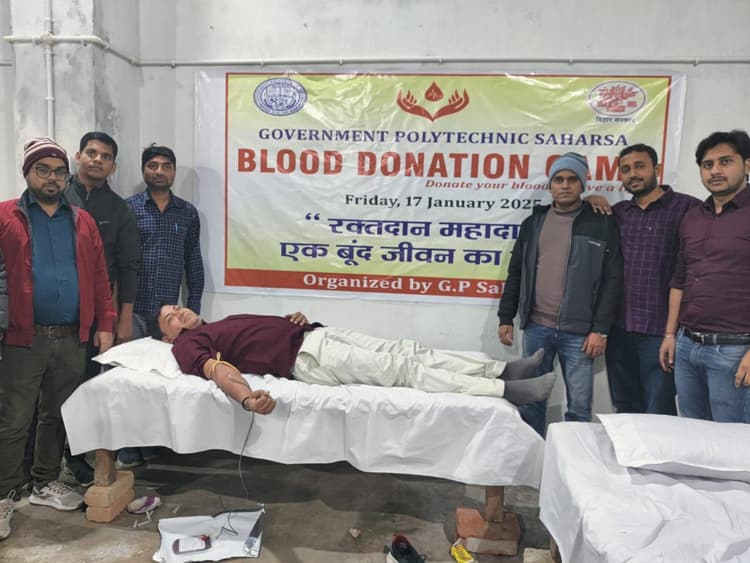 राजकीय पोलिटेक्निक में रक्तदान शिविर का हुआ आयोजन सहरसा. राजकीय पोलिटेक्निक प्रांगण में रक्तदान शिविर का आयोजन सदर अस्पताल की देखरेख में किया गया. इस कार्यक्रम में संस्थान के व्याख्याता, कर्मी व छात्र-छात्राओं ने उत्साहपूर्वक भाग लिया. कार्यक्रम का आयोजन व्याख्याता सह समन्वयकर्ता विक्रम कुमार के द्वारा किया गया. जिसकी शुरूआत प्रो. सिद्धांंत मल्लिक ने रक्तदान कर किया. इसके बाद व्याख्याताओं, कर्मियों व इच्छुक छात्रो ने अपने स्वेच्छा से रक्तदान किया. इस अवसर पर संस्थान के प्राचार्य प्रो. मिथुन कुमार, प्रो. शुभम, प्रो. धर्मेन्द कुमार, प्रो. मिंटू कुमार, अतिथि अनुदेशक मनीष कुमार वछात्रों ने स्वेच्छा से रक्तदान किया. संस्थान के प्राचार्य प्रो मिथुन कुमार ने कहा कि सभी कर्मियों ने अपने स्वेच्छा से रक्दान कर समाज के प्रति अपनी जिम्मेदारी निभाई. कार्यक्रम के अंत में प्राचार्य प्रो मिथुन कुमार ने रक्तदान करने वाले सभी व्याख्याताओं, कर्मियों एवं छात्र-छात्राओं को धन्यवाद देते कहा कि ऐसे आयोजनों को भविष्य में भी आयोजित करने की आवश्यकता है.