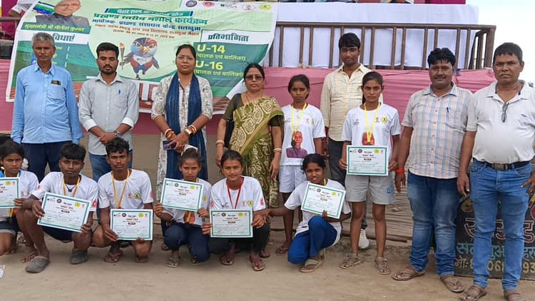 प्रखंड स्तरीय मशाल खेल प्रतियोगिता का समापन, विजयी खिलाड़ियों को किया गया पुरस्कृत सलखुआ . प्रखंड के महंथ मिट्ठू दास उच्चतर माध्यमिक विद्यालय के खेल मैदान में बिहार सरकार की खेल प्रतिभा खोज योजना अंतर्गत आयोजित प्रखंड स्तरीय खेल प्रतियोगिता का समापन हो गया. इस प्रतियोगिता में दौड़, लंबी कूद, क्रिकेट बॉल थ्रो, कबड्डी, फुटबॉल, साइकलिंग आदि का आयोजन किया गया था. प्रखंड स्तरीय मशाल प्रतियोगिता में प्रतियोगिता में संकुल के विभिन्न स्कूलों के अंदर-14 व अंदर-16 बालक-बालिकाओं ने भाग लिया. अंडर 16 में 800 मीटर की दौड़ में संकुल संसाधन केंद्र कबीरा की कोमल कुमारी ने प्रथम स्थान प्राप्त किया, वही द्वितीय स्थान भरत कुमार, अंडर 14 में शिव कुमार ने साइकिलिंग रेस में द्वितीय स्थान प्राप्त किया. इसी तरह अंडर 16 और अंडर 14 के सभी छात्र-छात्राएं में प्रथम, द्वितीय व तृतीय स्थान प्राप्त करने वाले विभिन्न विद्यालय के बच्चों को शिक्षा विभाग के अपर सचिव डॉ एस सिद्धार्थ व खेल विभाग के अपर सचिव डॉ बी राजेंदर द्वारा हस्ताक्षरित मार्शल 2024 का प्रमाण पत्र, मेडल देकर सम्मानित किया गया. पुरस्कार वितरण समारोह में मौजूद बीआरपी सह बिहार राज्य प्रारंभिक शिक्षक संघ के प्रखंड अध्यक्ष सुदर्शन कुमार गौतम ने कहा कि मशाल प्रतियोगिता का मुख्य उद्देश्य बिहार में खेलों के विकास के साथ-साथ कम उम्र के प्रतिभाशाली बच्चों का चयन कर उसे उच्च स्तरीय प्रशिक्षण देना और इन्हें राष्ट्रीय अंतरराष्ट्रीय स्तर के खिलाड़ी के रूप में तैयार करना है. अलग-अलग खेलों में प्रथम, द्वितीय एवं तृतीय स्थान पाए बच्चों को मेडल प्रमाण पत्र दिया गया. पुरस्कार का वितरण मुख्य अतिथि के रूप में मौजूद सीओ पुष्पांजलि कुमारी, बीडीओ सविता कुमारी के हाथों संपन्न हुआ. मौके पर अरविंद कुमार गुप्ता एचएम मध्य विद्यालय सलखुआ, बीआरपी कोपरिया राजीव रंजन, पूर्व साधनसेवी शिक्षक जयकृष्ण कुमार, अशोक कुमार सिंह, केशरी कुमार, कुमार रंजीत रंजन, राजेश कुमार, शाहिद आलम, चंदन कुमार, सुधांशु शेखर, सुदीन कुमार, संजय कुमार, उदित कुमार यादव, दिलीप कुमार, दिलीप पासवान सहित अन्य लोग मौजूद थे.