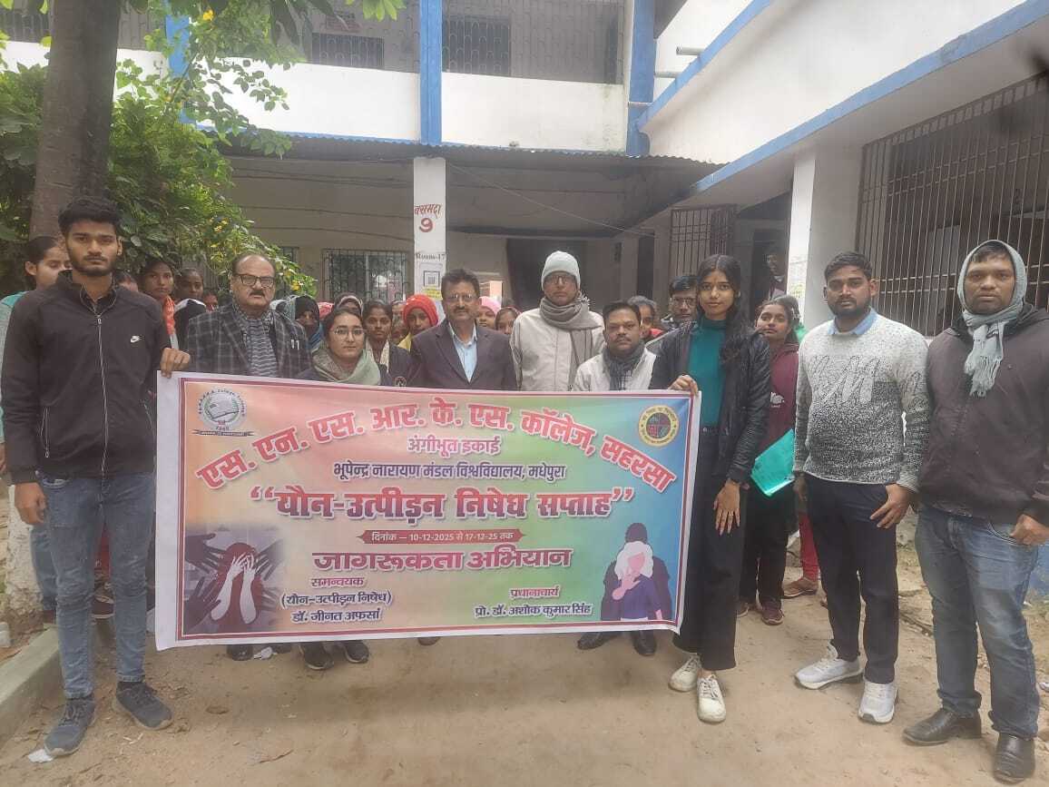 एसएनएस कॉलेज में यौन उत्पीड़न निषेध सप्ताह के तहत चलाया गया जागरूकता अभियान सहरसा . सर्व नारायण सिंह रामकुमार सिंह महाविद्यालय में यौन उत्पीड़न निषेध सप्ताह के तहत रविवार को जागरूकता अभियान चलाया गया. नयी श्रम संहिता कार्यस्थल पर सुरक्षा की गारंटी देता है. इसके लिए 2013 में कार्यस्थल पर महिलाओं के यौन उत्पीड़न अधिनियम बनाया गया है. इस मौके पर प्रधानाचार्य प्रो डॉ अशोक कुमार सिंह ने कहा कि हमारे महाविद्यालय में यौन उत्पीड़न पर सख्त प्रतिबंध रहेगा. उनके संज्ञान में ऐसे मामले आते हैं तो उसपर कड़ी कारवाई की जायेगी. कानूनी सलाह लेने की जरुरत पड़ी तो वो भी ली जायेगी. उन्होंने सहकर्मियों से कहा कि आपलोग इस मुद्दे की गंभीरता को समझें. यौन उत्पीड़न एक अपराध है. इसे अपराध की तरह लें. छात्र-छात्राओं से उन्होंने कहा कि आपलोग भी अपनी भावनाओं पर नियंत्रण रखें. महाविद्यालय में ऐसा कोई काम नहीं करें जिससे महाविद्यालय का नाम खराब हो. यह महिलाओं की गरिमा व सम्मान से जुड़ा मसला है. हम सभी को इसकी संवेदनशीलता को समझना होगा. इस मौके पर डॉ धर्मव्रत चौधरी ने कहा कि देश की अर्थव्यवस्था को सर्वोच्च स्तर पर ले जाने के लिए महिलाओं की भागीदारी आवश्यक है. इसके लिए जरूरी है कि कार्यस्थल पर महिलाओं का यौन उत्पीड़न नहीं होना सुनिश्चित हो. कार्यक्रम के कोऑर्डिनेटर डॉ जीनत अफसा ने कहा कि यौन उत्पीड़न जागरूकता सप्ताह हमें सम्मान व सुरक्षा का महत्व सिखाता है. हर व्यक्ति को बिना डर के सुरक्षित वातावरण में जीने का अधिकार है. चुप्पी अपराध को बढ़ावा देता है एवं जागरूकता उसे रोकती है. आयें हम सब मिलकर सही के लिए खड़े हों व बदलाव लायें. मौक़े पर डॉ अनिल कुमार सिंह, डॉ. सुधीर कुमार सिंह, डॉ महानंद सदा, डॉ अवधेश मिश्रा, डॉ आर्य सिन्धु, डॉ रामनरेश पासवान, डॉ दिलशाद अख्तर, डॉ गौरी, डॉ नृपेंद्र श्रीवास्तव, डॉ सुधांशु शेखर, ओमप्रकाश सिंह, सत्यम कुमार, मो इमरान, विश्वजीत कुमार, मो तौसीफ़, माही राज सहित अन्य शिक्षक, शिक्षकेत्तर कर्मचारी एवं छात्र -छात्राएं मौजूद थे.