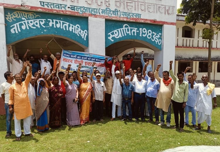 महिषी. क्षेत्र के लहटन चौधरी इंटर कॉलेज पस्तवार बलुआहा में अनुदान नहीं वेतनमान फोरम के आह्वान पर शिक्षकों व शिक्षकेत्तर कर्मियों ने आक्रोश रैली निकाल राज्य सरकार की नीतियों पर विरोध जताया. प्राचार्य सुभाष चंद्र झा की अगुवाई व वरीय शिक्षक प्रो नरेंद्र मोहन खां के संयोजन में रैली में शामिल कर्मियों ने जमकर नारेबाजी की. प्राचार्य ने बताया कि आजाद भारत में बिहार में वित्त रहित शिक्षा नीति एक अभिशाप है. महाविद्यालय कर्मी दशकों से सेवा कर भुखमरी में जीन को विवश हैं. प्रो मदन मोहन ठाकुर, नंद कुमार खां सहित अन्य ने बताया कि सरकार विधान परिषद के शिक्षा समिति के अनुशंसा को मंजूरी नहीं देगी तो चरणबद्ध उग्र आंदोलन किया जाना हमारी मजबूरी होगी. आगामी 9 जुलाई क़ो जिला मुख्यालय व तत्काल बाद राजधानी पटना में प्रदेश के वित्त रहित कर्मी रैली का संयोजन किया जायेगा. विधानसभा चुनाव में सत्ता क़ो बेदखल करने की मुहिम चलाई जायेगी व सुशासन कुमार क़ो मुंह की खानी होगी. आक्रोश रैली में प्रो शंभु सिंह, प्रो. लोचन मिश्र, प्रो. अशोक राय, प्रो.अजय कुमार वर्मा, प्रो. रंजीत कुमार राय, प्रो अवधेश दत्त, राधेश्याम पासवान, कलानंद पासवान, कैलाश गुप्ता सहित अन्य शामिल थे.