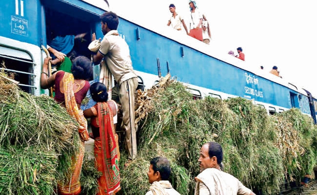 समस्तीपुर : बाढ़ के कारण समस्तीपुर व खगड़िया के कई इलाकों में फसल डूब गयी है. इसके कारण लोग ट्रेन से बेगूसराय के इलाके में पशुओं के लिए चारा लेने आते हैं और ट्रेन से इस तरह लाद कर ले जाते हैं.