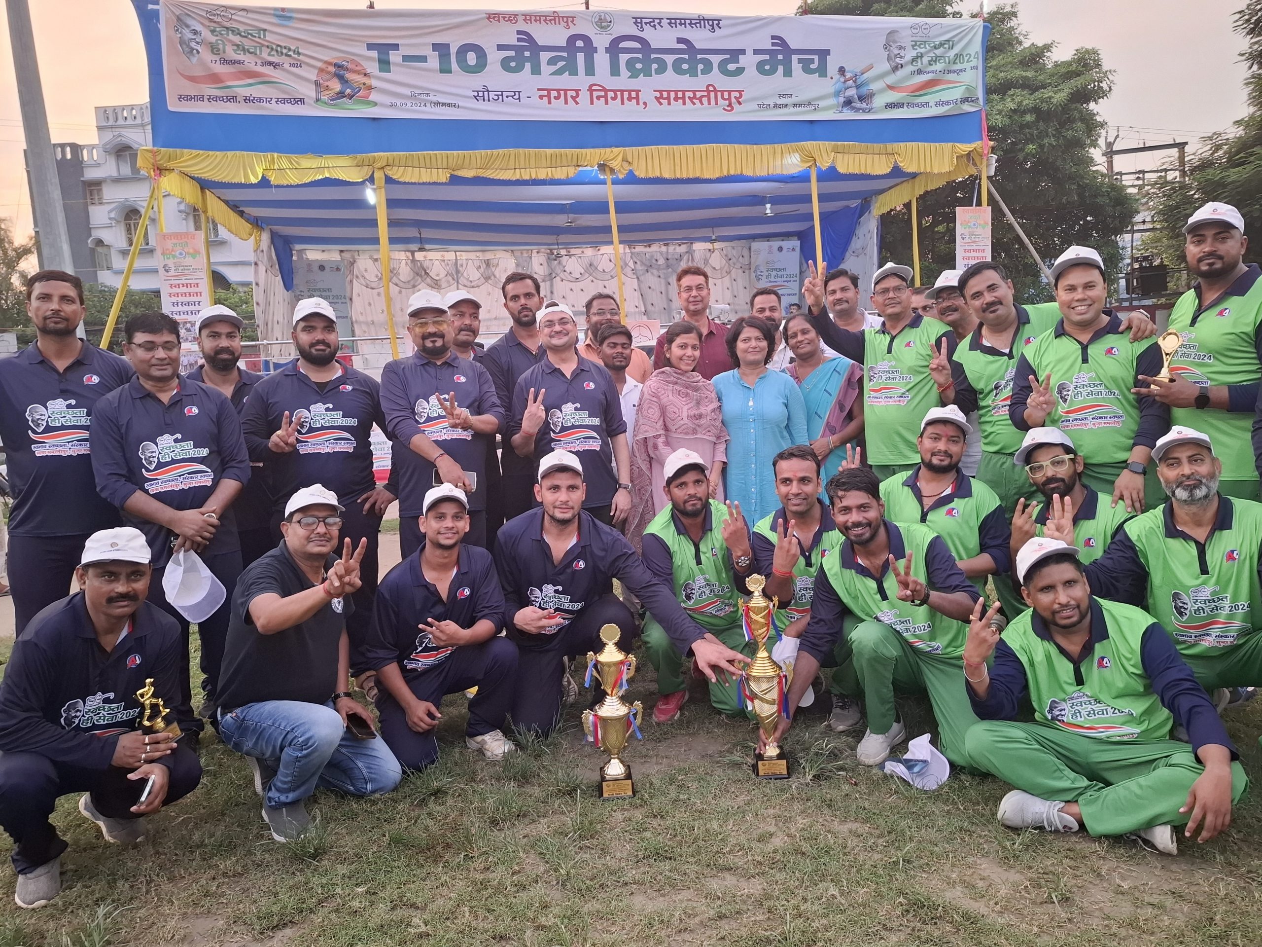 Chamber of Commerce defeats Rotary Club समस्तीपुर : स्वच्छता ही सेवा कैंपेन स्वभाव स्वच्छता, संस्कार स्वच्छता के तहत शहर के पटेल मैदान में सोमवार को चैंबर ऑफ कॉमर्स ने मैत्री क्रिकेट मैच में रोटरी क्लब को 6 विकेट से पराजित कर स्वच्छता ट्रॉफी पर कब्जा जमाया. इससे पूर्व मैच का विधिवत उद्घाटन नगर आयुक्त केडी प्रज्ज्वल ने दोनों टीमों के खिलाड़ियों से परिचय प्राप्त कर किया. निर्धारित 10 ओवर के मैच में रोटरी क्लब के कप्तान ने टॉस जीतकर पहले बल्लेबाजी करते हुए बल्लेबाज अजीत पाल के 33 एवं गिरिधर के 15 रनों की बदौलत 4 विकेट के नुकसान पर निर्धारित ओवर में 89 रनों का संघर्षपूर्ण स्कोर खड़ा किया. चैंबर ऑफ कॉमर्स के गेंदबाज अरशद, साजन, अमर एवं संदीप ने क्रमशः 1-1 विकेट चटकाये. 89 रनों के जवाब में बल्लेबाजी करने उतरी चैंबर ऑफ कॉमर्स की टीम के अमर के 27, निखिल के 25 एवं राकेश कुमार छोटू के 14 रनों की बदौलत 9.1 ओवर में 4 विकेट खोकर 90 रन बना मैच जीत लिया. रोटरी क्लब के गेंदबाज गिरिधर, आकिब व राहुल ने 1-1 विकेट प्राप्त किया. इस मैच में राजेश कुमार अकेला एवं सुभीत कुमार सिंह ने निर्णायक की भूमिका निभाई. मौके पर आयोजित पुरस्कार वितरण समारोह के मुख्य अतिथि महापौर अनीता राम व नगर आयुक्त के डी प्रज्ज्वल ने विजेता व उपविजेता टीम को चमचमाती ट्रॉफी प्रदान की. मौके पर डा. अमृता, डा कनू प्रिया, डा आर. के मिश्रा, डा आरके सिंह, डा विभास रंजन, विमल केडिया, उप नगर आयुक्त, नगर प्रबंधक रघुनाथ पासवान, स्वच्छता विवेक कुमार सहित निगम के सभी वार्ड पार्षद मौजूद थे.