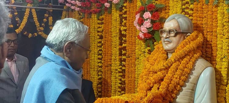 समस्तीपुर : बिहार के मुख्यमंत्री नीतीश कुमार भारत रत्न जननायक कर्पूरी ठाकुर की 101वीं जयंती के अवसर पर उनके पैतृक गांव कर्पूरीग्राम पहुंचे. हेलिपैड से सीधे उनके आवास स्मृति भवन पहुंचे. जहां उनकी प्रतिमा पर माल्यार्पण किया. वहां पर आयोजित सर्वधर्म सद्भाव कार्यक्रम में भाग लिया गया. तत्पश्चात मुख्यमंत्री गोखुल महाविद्यालय में स्थित कर्पूरी ठाकुर की प्रतिमा त्रिमूर्ति पर माल्यार्पण किया गया. उन्हें श्रद्धा सुमन अर्पित की. इस अवसर पर मुख्यमंत्री ने कर्पूरी ठाकुर के जीवन वृत्तांत के बारे में संक्षेप में बताया. उनके त्याग और समर्पण का जिक्र किया. गरीबों एवं पिछड़ों के लिए उनके द्वारा किये गये योगदान का भी जिक्र किया. विदित हो कि कर्पूरी ठाकुर बिहार के दो बार मुख्यमंत्री पद को सुशोभित कर चुके हैं. इस अवसर पर मुख्यमंत्री के साथ मंत्री जल संसाधन विभाग विजय कुमार चौधरी, मंत्री ग्रामीण विकास विभाग श्रवण कुमार, केन्द्रीय कृषि राज्य व किसान कल्याण मंत्री रामनाथ ठाकुर सहित कई गणमान्य लोग व अधिकारी मौजूद थे.