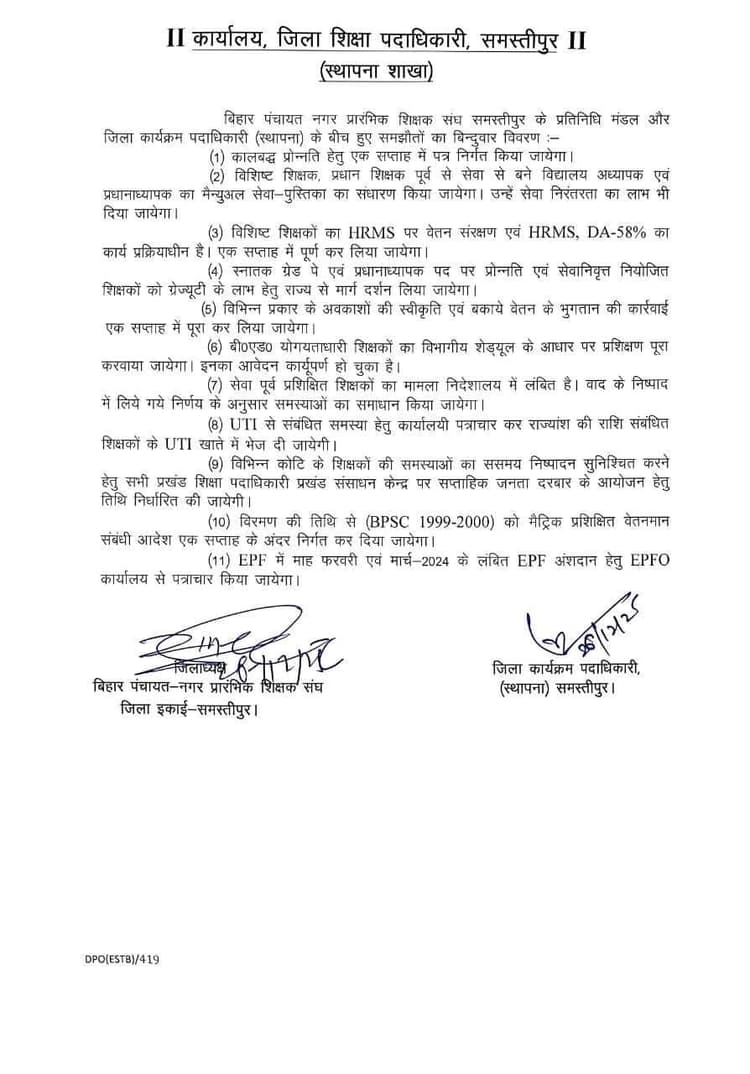 Samastipur News:समस्तीपुर : जिला शिक्षा विभाग का डीपीओ स्थापना संभाग अपनी डपोरशंखी आश्वासन को लेकर एक बार फिर से सुर्खियों में है. बीते शुक्रवार को बिहार पंचायत नगर प्रारंभिक शिक्षक संघ और डीपीओ स्थापना के बीच 11 बिंदु पर हुए समझौते शिक्षकों के बीच चर्चा का विषय बना हुआ है. राज्य स्तर से गाइडलाइन जारी हुए बिना डीपीओ स्थापना और संघ के समझौता में सेवा निरंतरता दिये जाने का आश्वासन कई एक प्रश्नचिह्न खड़ा कर रहा है. बताते चलें कि उक्त संघ ने विगत 26 दिसम्बर को जिला शिक्षा भवन पर जिलाध्यक्ष रामचन्द्र राय के नेतृत्व में दर्जनों शिक्षकों ने अनिश्चितकालीन अनशन शुरू किया था. शाम में जिला शिक्षा विभाग ने सक्रियता दिखाते हुए डीपीओ स्थापना और संघ के जिला अध्यक्ष के बीच आपसी समझौता में 11 बिंदुओं पर सहमति बनी. डीपीओ स्थापना ने लिखित आश्वासन दिया. इसमें दूसरे समझौते में विशिष्ट शिक्षक, प्रधान शिक्षक पूर्व से सेवा से बने विद्यालय अध्यापक व प्रधानाध्यापक का मैन्युअल सेवा पुस्तिका का संधारण किया जायेगा. उन्हें सेवा निरंतरता का लाभ भी दिया जायेगा संबंधी डीपीओ ने आश्वासन दिया है. जानकारों की माने तो शिक्षा विभाग ने विशिष्ट शिक्षक, प्रधान शिक्षक और प्रधानाध्यापक को वेतन संरक्षण का लाभ देने का आदेश तो दिया है लेकिन सेवा निरन्तरता संबंधी कोई आदेश निर्गत नहीं किया है और ना ही इस पर कोई गाइडलाइन ही जारी किया है. इसके बावजूद डीपीओ स्थापना ने इस बिंदु पर समझौता किया है. शिक्षक का कहना है कि सेवा निरन्तरता के आदेश से प्राथमिक से उच्च माध्यमिक स्तर के सभी विशिष्ट और विद्यालय अध्यापक को इसका लाभ मिलेगा. जिसके लिए विभिन्न संघ द्वारा राज्य स्तर से लगातार मांग भी की जा रही है. सूत्रों की माने तो व्यापक आंदोलन को देखते हुए डीपीओ स्थापना ने आनन फानन में विभाग से इतर जाकर समझौता कर लिया है जो जिला शिक्षा विभाग के लिए चिंता का विषय है.