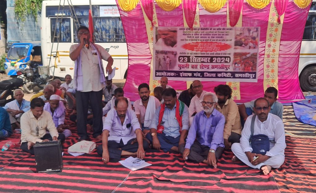 Insaaf Manch protest:समस्तीपुर : जिले के विद्यापतिनगर में मॉब लिचिंग के शिकार पीड़ित को मुआवजा व दोषियों पर कार्रवाई समेत छह सूत्री मांगों के समर्थन में इंसाफ मंच के बैनर तले स्थानीय कार्यकर्ताओं ने सोमवार को सरकारी बस पड़ाव में धरना किया. धरनास्थल पर संगठन के जिलाध्यक्ष डा. खुर्शीद खैर की अध्यक्षता में प्रतिरोध सभा हुई. सभा को संबोधित करते हुए वक्ताओं ने स्थानीय पुलिस प्रशासन की कार्यप्रणाली पर सवाल उठाया. भाकपा माले जिला स्थाई समिति के सदस्य सुरेन्द्र प्रसाद सिंह ने कहा कि जिले में अपराध चरम पर है. अपराधियों का बोलबाला है. पुलिस मूकदर्शन बनी है. इसके अलावे अन्य वक्ताओं ने भी अपने विचार रखें. इसके उपरांत संगठन के जिलाध्यक्ष के नेतृत्व में प्रतिनिधि मंडल सदस्यों ने जिलाधिकारी को एक स्मार पत्र सौंपा. इसमें विद्यापतिनगर में मॉब लीचिंग के शिकार पीड़ित को मुआवजा और दोषियों पर कार्रवाई करने, अल्प संख्यक, दलित पर बढ़ते अपराध पर रोक लगाने, मुफस्सिल थाना क्षेत्र के हकीमाबाद में छात्रा के मौत की उच्च स्तरीय जांच करने की मांग की गई है. मौके पर भाकपा माले जिला सचिव प्रो. उमेश कुमार, महावीर पोद्दार, जीवछ पासवान, कौसर अख्तर खलील, गंगा प्रसाद पासवान, आसिफ होदा, अलाउद्दीन, जावेद हाशमी, फरमान, शकूर, दीपक यदुवंशी, तनंजय प्रकाश, पप्पू खां समेत दर्जनों कार्यकर्ता मौजूद रहे.