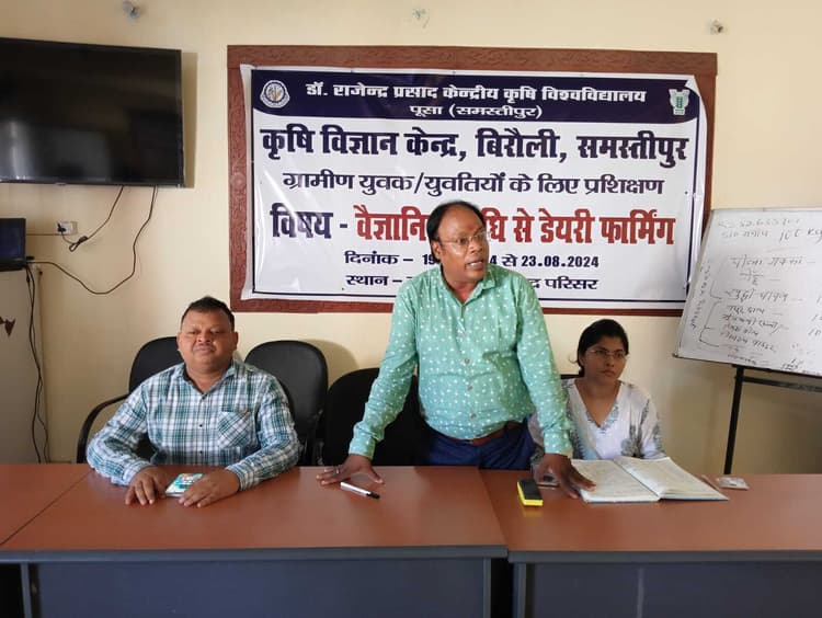 पूसा : डॉ. राजेंद्र प्रसाद केन्द्रीय कृषि विश्वविद्यालय के अधीनस्थ कृषि विज्ञान केंद्र बिरौली के परिसर में चल रहे पांच दिवसीय डेयरी फार्मिंग प्रशिक्षण के तीसरे दिन डॉ. मनीष कुमार ने सभी किसानों को सरकार की द्वारा दी जाने वाली योजनाओं के बारे में विस्तृत जानकारी दी. जिसमें बिहार सरकार एवं भारत सरकार की योजनाएं शामिल है. डॉ. मनीष ने पशुओं में लगने वाले विभिन्न प्रकार की बीमारियों के बचाव और रखरखाव संबंधित भी जानकारी सभी प्रशिक्षणार्थियों को दी. इसके अलावा सरकार की योजनाओं के लिए जो प्रोजेक्ट तैयार किया जाता है उसके लिए भी पशुपालकों को आग्रह किया कि उनसे या कृषि विज्ञान केंद्र से तकनीकी जानकारी लेकर आप उसको बना सकते हैं. योजनाओं का फायदा ले सकते हैं. पशुओं के आवास व्यवस्था को कैसे ठीक किया जाए और किस प्रकार के आवास उनके लिए बनाए जाएं इसकी भी जानकारी दी गयी.