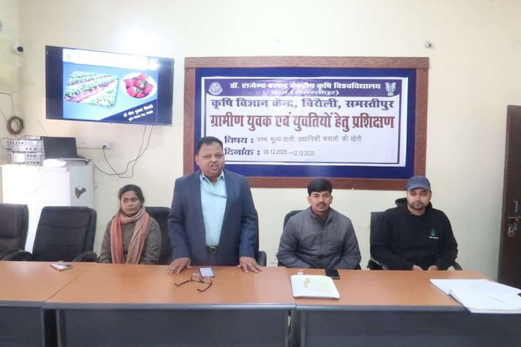 Samastipur News:पूसा : डॉ राजेन्द्र प्रसाद केन्द्रीय कृषि विश्वविद्यालय के अधीनस्थ कृषि विज्ञान केंद्र बिरौली के सभागार में ग्रामीण युवक एवं युवतियों के लिए उच्च मूल्य वाली उद्यानिकी फसलों की खेती विषय पर चार दिवसीय प्रशिक्षण शुरू हुआ. अध्यक्षता करते हुए केंद्र के प्रमुख वैज्ञानिक डॉ आरके तिवारी ने कहा कि इस प्रशिक्षण का उद्देश्य ग्रामीण युवाओं को अधिक लाभ देने वाली बागवानी फसलों की जानकारी देकर उन्हें आत्मनिर्भर बनाना और स्वरोजगार के लिए प्रेरित करना है. उन्होंने कहा ग्रामीण युवाओं को कृषि क्षेत्र में उद्यमिता अपनाने के लिए प्रेरित किया गया. डॉ. तिवारी ने कहा कि पारंपरिक खेती के साथ-साथ उच्च मूल्य वाली फसलों स्ट्राबेरी, शिमला मिर्च, ड्रैगन फ्रूट, बेमौसमी सब्जियों, मशरूम और फूलों की खेती पर ध्यान केंद्रित करके किसान अपनी आय को कई गुना बढ़ा सकते हैं. उन्होंने जोर दिया कि तकनीकी ज्ञान और बाजार की समझ आज के कृषि व्यवसाय की रीढ़ है. यह प्रशिक्षण युवाओं को उसी दिशा में मजबूत करेगा. इस चार दिवसीय प्रशिक्षण में युवाओं को उद्यानिकी विशेषज्ञ डॉ धीरु कुमार तिवारी ने विस्तार से जानकारी दी. उन्होंने प्रतिभागियों को उच्च मूल्य वाली उद्यानिकी फसलों की खेती के बारे में की जाने वाली प्रबंधन तकनीकों पर प्रशिक्षित किया. प्रशिक्षण के दौरान उत्तम प्रभेदों, संतुलित पोषक तत्व प्रबंधन, सूक्ष्म सिंचाई, मल्चिंग व रोग एवं कीट प्रबंधन के बारे में विस्तृत चर्चा की. प्रशिक्षण में सैद्धांतिक ज्ञान के साथ-साथ व्यावहारिक सत्र भी शामिल थे. जिससे प्रतिभागियों को सीखने का बेहतर अवसर मिला. प्रशिक्षण के समय निशा रानी, किसान मनोज, गणेश सहित 35 किसान मौजूद थे.