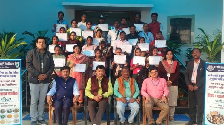 पूसा : डा राजेंद्र प्रसाद केंद्रीय कृषि विश्वविद्यालय स्थित एडवांस सेंटर ऑफ मशरूम रिसर्च के तत्वावधान में अनुसंधान निदेशालय के सभागार में मशरूम उत्पादन सह प्रसंस्करण विषय पर चल रहे पांच दिवसीय प्रशिक्षण प्रमाण पत्र एवं मशरूम किट वितरण के साथ सम्पन्न हुई. अध्यक्षता करते हुए निदेशक अनुसंधान डा अनिल कुमार सिंह ने कहा कि बिहार के सभी जिलों में मशरूम के सभी छह प्रभेदों की खेती बेहतर प्रारूप के साथ जोशोखरोश से चल रही है. राष्ट्रीय एवं अंतरराष्ट्रीय स्तर पर मशरूम से बने विभिन्न उत्पादों को ऑनलाइन मार्केटिंग से जोड़ने की जरूरत है. जिससे किसान कम लागत में अपने हस्तनिर्मित उत्पादों को बेहतर बाजार में बेच सके. राज्य स्तर पर मशरूम उत्पादन के क्षेत्र में दर्जनभर से अधिक पंजीकृत एफपीओ का संचालन किया जा रहा है. सभी एफपीओ में हजारों की संख्या में मशरूम उत्पादक जुड़े हुए हैं. स्वागत भाषण मशरूम केंद्र प्रभारी डॉ आरपी प्रसाद ने की. संचालन डा सुधानंदनी ने किया. वहीं धन्यवाद ज्ञापन मशरूम विशेषज्ञ डा दयाराम ने किया. मौके पर एडीआर डा एसएन ठाकुर, सुभाष कुमार, मुन्नी, निशा आदि मौजूद थे.