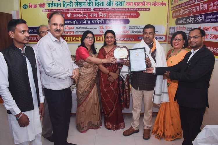 रोसड़ा : शहर के पंजियार टोली वार्ड नं 14 निवासी साहित्यकार पंकज कुमार पाण्डेय को साहित्य के क्षेत्र में उनके योगदान के लिए अंतरराष्ट्रीय तथागत विशिष्ट सृजन सम्मान से सम्मानित किया गया है. गत रविवार को उत्तरप्रदेश के सिद्धार्थनगर में आयोजित 9 वां अंतरराष्ट्रीय तथागत सम्मान समारोह 2024 के अवसर उन्हें यह सम्मान दिया गया. उनके साहित्यिक अवदान के लिए उन्हें यह सम्मान गृह मंत्रालय राजभाषा विभाग के सहायक निदेशक डॉ रघुवीर शर्मा, नेपाल की सांसद डॉ रेखा यादव, जिला एवं सत्र न्यायाधीश सिवान प्रतिभा चौहान, मिरिक दार्जलिंग की पूर्व चेयरपर्सन डॉ कमला तमांग,आयकर आयुक्त गोरखपुर अमलेंदु नाथ मिश्र और प्रख्यात साहित्यकार राजेन्द्र परदेसी द्वारा उन्हें शॉल, मोमेंटो, प्रशस्ति पत्र और नगद राशि प्रदान कर सम्मानित किया गया. साहित्यकार मित्र राहुल शिवाय, अविनाश भारती, रामनाथ बेखबर, शिव कुमार सुमन, विकास कुमार विधाता, बाबा बैद्यनाथ झा, डॉ कमल किशोर चौधरी, पूनम झा सुधा, आशा पाण्डेय ओझा, दिलीप कुमार पाठक, ज्योति मानव, हरिनारायण सिंह हरि, विजयव्रत कंठ, रूपम झा, कस्तूरी झा कोकिल, ज्वाला सांध्यपुष्प, अवधेश्वर प्रसाद सिंह, प्रफुल्ल चंद्र ठाकुर, मनोज झा, शंकर सिंह सुमन, सत्यसंघ भारद्वाज, सुनील कुमार यादव, प्रो प्रवीण कुमार प्रभंजन, डॉ अनुराग कुमार आदि ने बधाई दी है.