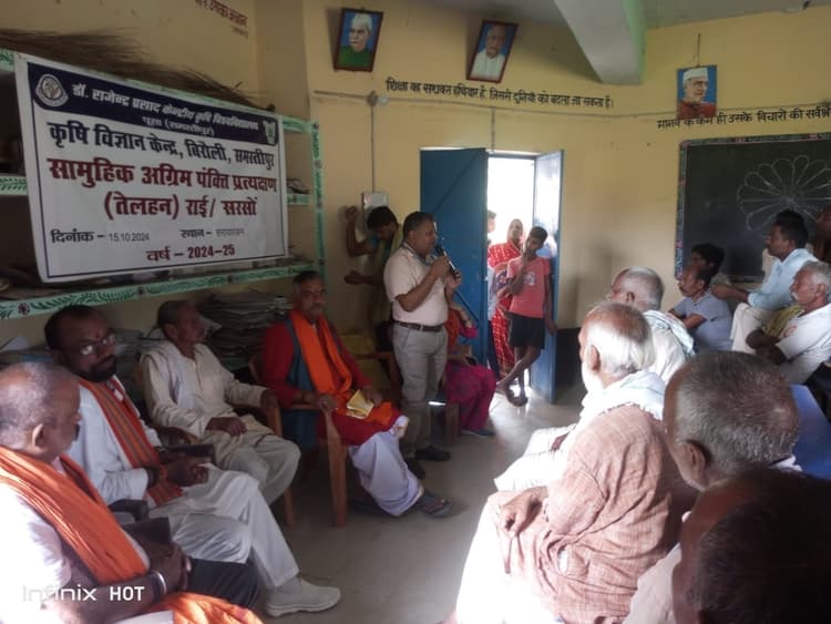 Samastipur News: Scientists gave information about oilseed cultivation सरायरंजन : कृषि एवं किसान कल्याण मंत्रालय भारत सरकार के द्वारा तिलहन के उत्पादन के बढ़ाने के लिए कृषि विज्ञान केंद्र के माध्यम से सामूहिक अग्रिम पंक्ति प्रत्यक्षण का कार्यक्रम चलाया जा रहा है. इसके तहत मंगलवार को कृषि विज्ञान केंद्र बिरौली जो कि डॉक्टर राजेंद्र प्रसाद केंद्रीय कृषि विश्वविद्यालय के अधीनस्थ एक केंद्र है के द्वारा सरायरंजन प्रखंड के बहादुरपुर अरमौली में लगभग 100 किसानों के साथ यह कार्यक्रम किया गया. इसमें तिलहन के उत्पादन में लगे सभी किसानों को राई और तोड़ी की खेती की जानकारी दी गई. साथ ही साथ किन प्रकार के बीजों का प्रयोग करना है, खेती की तैयारी कैसे करनी है, किस प्रकार पौधे का संरक्षण करना है इत्यादि जानकारी कृषि विज्ञान केंद्र के वरीय वैज्ञानिक डॉ. आरके तिवारी ने दी. वहीं चयनित किसानों को इस कार्यक्रम के तहत बीज एवं अन्य उपादान भी दिये गये. कार्यक्रम का उद्देश्य पूरे देश में तिलहन उत्पादन को बढ़ाना है.