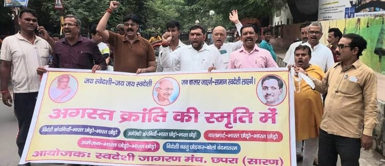 छपरा. स्वदेशी जागरण मंच के तत्वावधान में अमेरिकी राष्ट्रपति डोनाल्ड ट्रम्प के टैक्स बढ़ाने के निर्णय के विरोध में छपरा की सड़कों पर पैदल मार्च निकाला गया. व्यावसायी श्याम बिहारी अग्रवाल ने पैदल मार्च करते हुए बताया अमेरिकी राष्ट्रपति डोनाल्ड ट्रम्प द्वारा भारत से आयातित कई उत्पादों पर टैक्स बढ़ाने के निर्णय का हम कड़ा विरोध करते हैं. यह निर्णय न केवल हमारे देश के व्यापारियों और उद्योगपतियों के हितों को नुकसान पहुंचायेगा, बल्कि दोनों देशों के बीच व्यापारिक संबंधों को भी प्रभावित करेगा. हमारी मांग है कि अमेरिकी सरकार अपने इस निर्णय को तुरंत वापस ले और भारत के साथ व्यापारिक संबंधों को मजबूत बनाने के लिये काम करे. हमें विश्वास है कि दोनों देशों के बीच व्यापारिक संबंधों में सुधार हो सकता है, अगर दोनों देश मिलकर काम करें. हमारी आपत्ति के मुख्य रूप से यह निर्णय हमारे देश के निर्यात पर बहुत बुरा प्रभाव डालेगा, हमारे देश के व्यापारियों और उद्योगपतियों को आर्थिक नुकसान होगा,दोनों देशों के बीच व्यापारिक संबंधों पर नकारात्मक प्रभाव पड़ेगा, स्वदेशी जागरण मंच के प्रान्त सह संयोजक हर्षुल ब्रजेश ने कहा हमें स्वदेशी को अपनाना होगा और वोकल फॅार लोकल को आगे बढ़ाना होगा तथा अमेरिकन समानों का बहिष्कार करना होगा. पैदल मार्च में सभी ने नारे लगाये. स्वदेशी अपनाओ विदेशी भगाओ, दुध दही के देश में पेप्सी कोला नाली में आदि तरह-तरह के नारे लगाए गये. पैदल मार्च में मुख्य रूप से प्रसिद्ध व्यावसायी श्याम बिहारी अग्रवाल, स्वदेशी जागरण मंच के प्रान्त सह संयोजक हर्षुल ब्रजेश, जिला संयोजक जय वर्धन साहू, स्वावलंबी भारत अभियान प्रान्त सह संयोजक यशराज वर्धन अधिवक्ता, सत्य प्रकाश वर्मा, अनिरुद्ध सिंह, प्रवीण कुमार सिंह, विजय सिंह, जितेन्द्र कुमार, करण आदि के साथ सैंकड़ो छपरा वासी शामिल हुये.