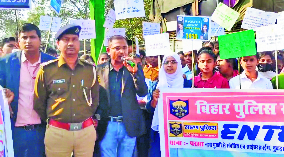 परसा. बिहार पुलिस सप्ताह 2025 के अवसर पर 22 से 27 फरवरी तक विभिन्न जागरूकता कार्यक्रमों का आयोजन किया जा रहा है. इसी क्रम में शनिवार को परसा थानाध्यक्ष सुनील कुमार के नेतृत्व में नशा मुक्ति व साइबर अपराध के खिलाफ एक विशाल जन जागरूकता अभियान चलाया गया. इस कार्यक्रम में अखंड ज्योति आइ हॉस्पिटल मस्तीचक और इंटेल्स कुशल युवक संस्था के सैकड़ों छात्र-छात्राओं ने भाग लिया. इस अभियान की शुरुआत अखंड ज्योति आइ हॉस्पिटल मस्तीचक से हुई, जहां से सैकड़ों छात्र-छात्राओं ने मस्तिचक मोड़, सैदपुर, परसा बाजार, खलीफा चौक, दरोगा राय चौक होते हुए हाइस्कूल चौक परसा तक प्रभात फेरी निकाली. इस दौरान छात्र-छात्राओं ने हाथों में बैनर और पोस्टर लेकर समाज को नशा मुक्ति और साइबर अपराध के प्रति जागरूक करने का संदेश दिया. इस कार्यक्रम में अखंड ज्योति आइ हॉस्पिटल मस्तीचक द्वारा नशा मुक्ति से जुड़ी झांकी निकाली गयी, जिसमें नशे के दुष्प्रभावों को चित्रित किया गया था. वहीं, इंटेल्स परसा के छात्रों ने साइबर अपराध से बचाव के लिए विभिन्न चौक-चौराहों पर नुक्कड़ नाटक प्रस्तुत किये. नुक्कड़ नाटक के माध्यम से बताया गया कि कैसे ऑनलाइन ठगी और साइबर क्राइम के जाल में फंसने से बचा जा सकता है. कार्यक्रम में अखंड ज्योति आइ हॉस्पिटल के निदेशक मृत्युंजय तिवारी, इंटेल्स परसा निदेशक डॉ विश्वकर्मा शर्मा अमित कुमार सिंह, जितेश राज, एसआइ दीपक कुमार, राजदेव दास, अजित लाल, गणेश समेत सैकड़ों छात्र-छात्राएं और स्थानीय ग्रामीण शामिल थे.कार्यक्रम को संबोधित करते हुए थानाध्यक्ष सुनील कुमार ने कहा कि समाज को नशे और साइबर अपराध से बचाने के लिए गांव-गांव तक जागरूकता फैलाना बेहद जरूरी है. उन्होंने लोगों को साइबर ठगी से बचने के लिए फ्रॉड कॉल, संदिग्ध मैसेज और अनजान लिंक पर क्लिक न करने की सलाह दी. साथ ही, किसी को भी ओटीपी साझा न करने और किसी भी संदिग्ध गतिविधि की सूचना तुरंत पुलिस को देने का आग्रह किया.