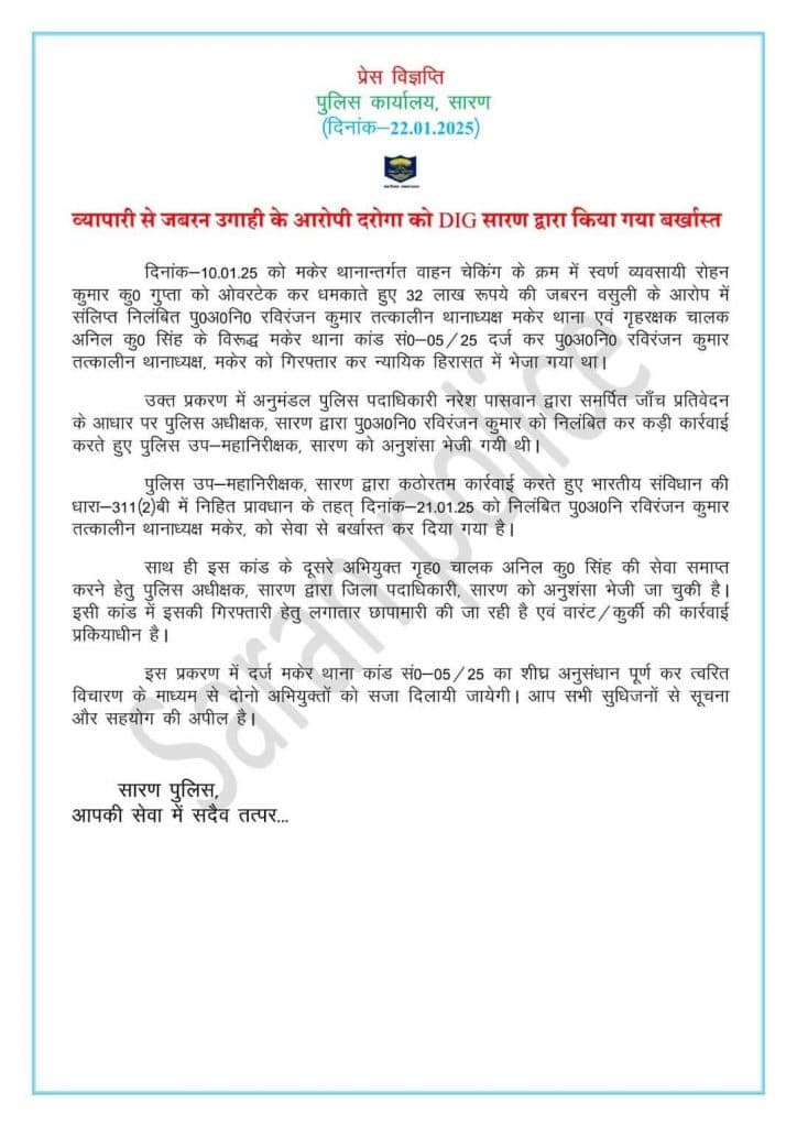 गौरतलब है कि पिछले 10 जनवरी को मकेर थाना क्षेत्र में वाहन चेकिंग के दौरान स्वर्ण व्यवसायी रोहन कुमार गुप्ता को धमका कर 32 लाख रुपये छीन लिया गया था. इस मामले की जांच के बाद तत्कालीन थानाध्यक्ष रविरंजन कुमार एवं गृहरक्षक चालक अनिल कुमार सिंह के विरुद्ध मकेर थाना में प्राथमिकी दर्ज हुई थी. इसमें थानाध्यक्ष रविरंजन कुमार को गिरफ्तार कर जेल भेजा गया था.