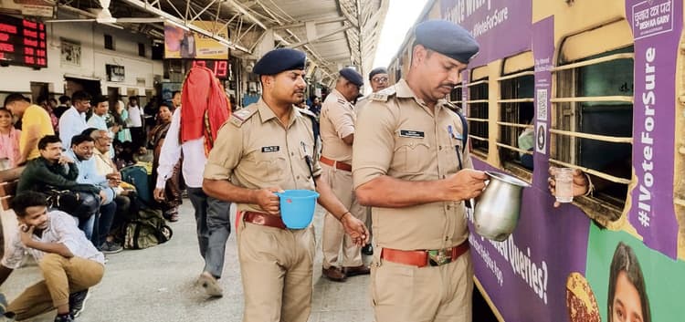 छपरा. छपरा जंक्शन पर आरपीएफ के सहायक सुरक्षा आयुक्त मुकेश पवार के निर्देश पर भीड़ नियंत्रण को लेकर सहायता बूथ बनाया गया है. जहां पर यात्रियों को सुरक्षा के साथ साथ सहायता प्रदान की जा रही है. ट्रेनों में इन दिनों भारी भीड़ को लेकर यात्रियों की सुरक्षा को ले आरपीएफ पूरी तरह से सजग है. अत्यधिक गर्मी के कारण प्लेटफॉर्म व ट्रेनों में आरपीएफ के द्वारा यात्रियों को पानी की व्यवस्था इस बूथ पर की गयी है. भीड़ होने के कारण यात्री कई यात्री जो प्लेटफार्म पर उतरने में सक्षम नही थे. वैसे यात्रियों को पुलिस पदाधिकारियों द्वारा पानी भी पिलाया गया. इस दौरान छपरा जंक्शन से होकर गुजरने वाली अप बिहार संपर्क क्रांति सुपरफास्ट, वैशाली सुपरफास्ट समेत काठगोदाम एक्सप्रेस ट्रेनों में भीड़ को लेकर यात्रियों के बीच पानी का वितरण किया गया. साथ ही कई ऐसे यात्री जो प्लेटफार्म पर उतरकर भीड़ होने के कारण नल तक नहीं पहुंच रहे थे. वैसे यात्रियों के बीच पानी पीने की व्यवस्था इस स्टॉल पर की गयी थी. स्टॉल पर बड़े ही आराम के साथ यात्री पानी पीकर आरपीएफ का शुक्रिया भी अदा करते नजर आये. इस दौरान आरपीएफ के उप निरीक्षक प्रमोद कुमार, धीरेंद्र कुमार सिंह, रामजी यादव समेत अन्य पुलिसकर्मी मौजूद रहे.