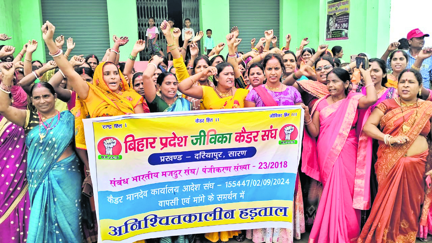. प्रखंड स्थित जीविका कार्यालय व शक्ति केंद्र दोनों जगहों पर अपनी मांगों को लेकर जीविका दीदियों ने गुरुवार को जमकर प्रदर्शन किया. साथ ही जीविका शक्ति केंद्र में ताला भी जड़ दिया. इसके बाद अनिश्चित कालीन हड़ताल पर चली गयी. ज्ञात हो कि अपनी विभिन्न मांगों को लेकर सभी जीविका दीदी पहले शक्ति केंद्र पर पहुंचीं. वहां एक बैठक की. इसके बाद शक्ति केंद्र में तालाबंदी कर प्रदर्शन शुरू शुरू कर दिया. फिर सभी जीविका दीदियां नारेबाजी करती हुई जीविका कार्यालय पर पहुंच गयी और वहां भी प्रदर्शन शुरू कर दिया. जीविका दीदियों ने बताया कि उनसे बंधुआ मजदूर की तरह काम कराया जाता है. फिर भी उनका मानदेय काफी कम है. जीविका दीदियों ने जीविका के अधिकारियों पर प्रताड़ित करते का भी आरोप लगाया. जीविका दीदियों ने सरकार से दस सूत्री मांग की. उनकी मांगों में पांच लाख का दुर्घटना बीमा देने, दो लाख का मेडिकल क्लेम देने, 25 हजार रुपये वेतनमान करने, 60 वर्ष की नौकरी पक्की करने आदि मांगें शामिल हैं. जीविका दीदियों ने कहा कि जबतक उनकी मांगे नहीं मानी जाएंगी हड़ताल जारी रहेगा. प्रर्दशन का नेतृत्व प्रीति कुमारी व आशा देवी ने संयुक्त रूप से किया. नीति देवी, इंदु देवी, उर्मिला देवी, पार्वती देवी, अनिता देवी, पूजा कुमारी, कविता कुमारी, रेखा कुमारी, गीता देवी, बेबी कुमारी आदि ने प्रर्दशन में भाग लिया.
