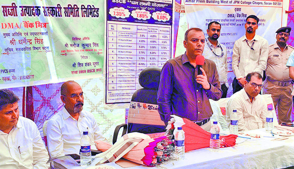 गड़खा. गड़खा प्रखंड प्राथमिक सब्जी उत्पादक सहकारी समिति लिमिटेड कार्यालय पर बिहार सहकारिता विभाग के सचिव धर्मेन्द्र कुमार सिंह, बिहार राज्य सब्जी प्रसंस्करण विपणन सहकारी संघ के प्रबंध निदेशक प्रभात कुमार, बिहार राज्य कोऑपरेटिव बैंक के प्रबंध निदेशक मनोज कुमार सिंह द्वारा डीएम बैंक मित्र का शुभारंभ किया गया. इस कार्यक्रम के दौरान हर थाली में बिहारी तरकारी योजना के तहत रिटेल आउटलेट का प्रदर्शनी लगाया गया. जिसका निरीक्षण मुख्य अतिथि द्वारा किया गया. सहकारिता विभाग के सचिव द्वारा अपने संबोधन में किसानों को खाद-बीज, कृषि लोन और अन्य किसान कल्याणकारी योजनाओं के बारे में जानकारी दी गयी. बिहार राज्य सहकारिता बैंक के प्रबंध निदेशक द्वारा किसानों को ऋण संबंधी जानकारी दी गयी. और साथ ही समय पर ऋण उपलब्ध करवाने का आश्वासन भी दिया गया. इस कार्यक्रम में गरखा प्राथमिक सब्जी उत्पादक सहकारी संघ के अध्यक्ष अंजन कुमार पाण्डेय द्वारा आए हुए अतिथियों का स्वागत किया गया साथ ही धन्यवाद संबोधन भी किया गया. इन्होंने आये हुए अतिथियों को आश्वस्त किया वो अपने क्षेत्र के सभी किसानों को सहयोग करके इस प्रखंड को सब्जी उत्पादन में उत्कृष्ट स्थान दिलायेगे. इस कार्यक्रम में सारण जिला के सभी प्रखंड सहकारिता अधिकारी, सारण जिला सहकारी बैंक के प्रबंध निदेशक और अन्य पदाधिकारी गण सम्मिलित हुए.