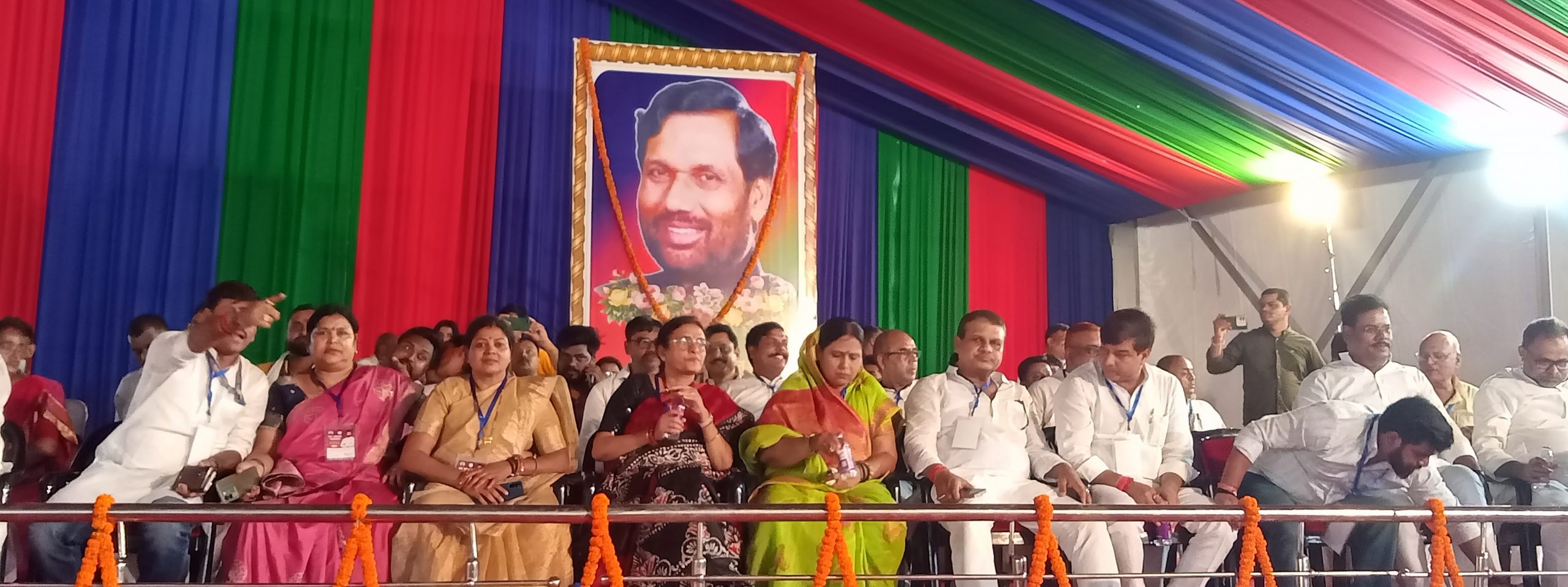 नोट:फोटो नंबर 6 सीएचपी 11 है कैप्सन होगा- मंच पर बैठे लोजपा के नेताप्रतिनिधि, छपरा. लोक जनशक्ति पार्टी (रा) के राष्ट्रीय अध्यक्ष और केंद्रीय मंत्री चिराग पासवान ने रविवार को छपरा के राजेंद्र स्टेडियम में आयोजित संकल्प महासभा के मंच से बिहार में बदलाव की हुंकार भरी. उन्होंने कहा कि बिहार फर्स्ट, बिहारी फर्स्ट की सोच के साथ मैं सारण की ऐतिहासिक धरती पर आया हूं.