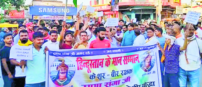 दाउदपुर(मांझी). छपरा सिवान मुख्य मार्ग स्थित स्थानीय बाजार दाउदपुर में रविवार को करणीसेना के सहयोगियों ने यूपी सपा सांसद रामजीलाल सुमन के अमर्यादित बयान के विरोध में पुतला दहन के साथ साथ शांति पूर्ण ढंग से कड़ा प्रदर्शन किया गया. युवाओं ने सपा सांसद का बयान देश हित मे गलत बताया और मुर्दाबाद के नारे लगाये. हमारा भारत सनातन धर्म और मान सम्मान के साथ शुर वीर रक्षक संग्राम सिंह “राणा सांगा जी का सम्मान करता है और करता रहेगा. सपा सांसद अपने जाति को लेकर अमर्यादित बयान के प्रति देश के सदन में माफी मांगे. अपनी कुंठित बयान से जाति विशेष को राजनीतिक तौर पर रोटियां सेकना बंद करे. अब 21वी सदी के युवाओं को अमन चैन से विकशित एवं आत्म निर्भर भारत के योगदान में लगने थे. देश के शूरवीरों का अपमान कटाई बर्दास्त नही किया जायेगा। प्रदर्शन के दौरान सैकड़ो राजपुताना समाज के लोग शामिल थे. जिसमें समाजसेवी, बरिष्ठ व युवा वर्ग में धारका सिंह, दयानन्द सिंह, भृगु सिंह, गजेंद्र सिंह, राजू सिंह मुखिया, राणा सिंह डब्लू, अंकित सिंह, चन्दन सिंह परमार,मुन्ना सिंह, पंकज सिंह,विजय प्रताप सिंह चुन्नू, राजन सिंघानिया, आदि मौजूद थे.