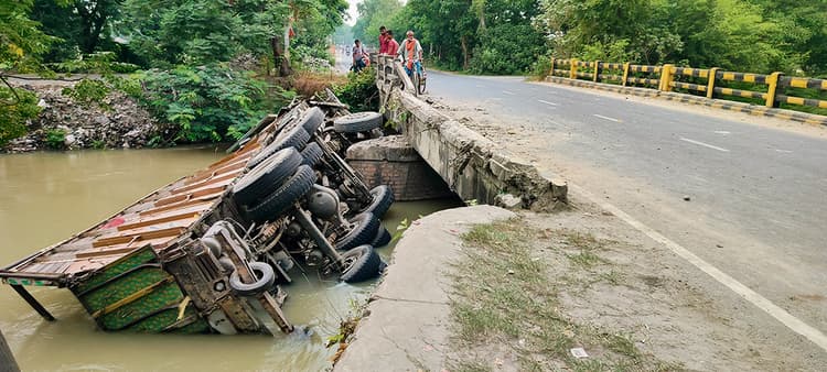 सारण जिले के तरैया-मशरक एसएच 73 मुख्य सड़क में रामबाग गंडक नहर पुल की रेलिंग तोड़ कर एक अनियंत्रित ट्रक सोमवार की रात पानी में जा गिरा. इस हादसे में ट्रक चालक बाल-बाल बच गया. प्रत्यक्षदर्शियों के अनुसार एक साथ बालू लदे कई ट्रक रात में लगभग 12 बजे तरैया की तरफ से जा रहे थे. ट्रकों की कतार में ये 12 चक्का ट्रक सबसे पीछे था, जो अनियंत्रित होकर पुल की लगभग 20 फुट रेलिंग तोड़ते हुए गंडक नहर के पानी में पलट गया. जानकारी के अनुसार ट्रक के अंदर सिर्फ चालक था. उपचालक नहीं था. हादसे के बाद चालक ने ट्रक का दरवाजा तोड़ कर पानी में कूद कर किसी तरह जान बचा कर बाहर निकला. रात में काफी तेज आवाज सुन कर आसपास के लोग दौड़ कर पहुंचे. तबतक चालक निकल कर कहीं छुप गया था. गंडक नहर पुल की बगल में स्थित कामख्या सिंह कुशवाहा ने बताया कि गर्मी के कारण चबूतरे पर बैठे थे कि ट्रक में कुछ खराबी के कारण काफी तेजी में आया और पुल की रेलिंग तोड़ते हुए गिर पड़ा. रेलिंग टूटने व ट्रक पलटने के दौरान जोड़दार आवाज हुई. घटना की सूचना पाकर रात में ही डायल 112 पुलिस की टीम व तरैया थानाध्यक्ष आशुतोष कुमार सिंह दलबल के साथ पहुंचे. ट्रक पलटने व पुल की रेलिंग टूटने के बावजूद यातायात सुचारु रूप से चल रहा है. लेकिन, तरैया-मशरक मुख्य मार्ग में स्थित गंडक नहर पुल ट्रक की ठोकर से पूरी तरह से हिल गया है. कभी भी ध्वस्त हो सकता है. उक्त पुल पर अब खतरा मंडराने लगा है. पटना से शीतलपुर, परसा, अमनौर, मढ़ौरा, तरैया, मशरक होते हुए सीवान, गोपालगंज व यूपी जाने वाले मुख्य मार्ग में स्थित पुल ध्वस्त हो जाने से आमजनों का काफी परेशानियों से गुजरना पड़ेगा.