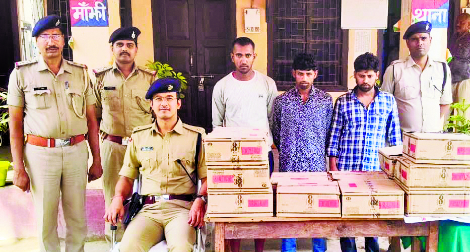 मांझी. मांझी पुलिस ने दो अलग-अलग स्थानों पर छापेमारी कर अंग्रेजी और देसी शराब की बड़ी मात्रा बरामद की और तीन धंधेबाजों को गिरफ्तार किया. इस दौरान पुलिस ने एक बाइक भी जब्त की. सहायक पुलिस अधीक्षक सह थानाध्यक्ष संकेत कुमार ने बताया कि पुलिस को गुप्त सूचना मिली थी कि जई छपरा से महम्मदपुर जाने वाली मुख्य सड़क पर खजुहटी गांव के समीप पुलिया के पास शराब बेचने की योजना बनायी जा रही थी. सूचना के आधार पर पुलिस ने छापेमारी की. छापेमारी के दौरान 129.60 लीटर अंग्रेजी शराब बरामद की गयी. इस मामले में वाहन मालिक सहित आधा दर्जन लोगों के खिलाफ नामजद और चार अज्ञात व्यक्तियों के खिलाफ प्राथमिकी दर्ज की गयी है. गिरफ्तार धंधेबाजों में दिनेश यादव, मोहित कुमार चौधरी और जगलाल चौधरी शामिल हैं. बाकी नामजद आरोपितों की गिरफ्तारी के लिए पुलिस की छापेमारी जारी है. इसके अलवा महम्मदपुर में भी पुलिस ने एक और छापेमारी की, जिसमें 17 लीटर देसी शराब बरामद की गयी. इस मामले में दो धंधेबाजों के खिलाफ नामजद प्राथमिकी दर्ज की गयी है. पुलिस टीम में सहायक पुलिस अधीक्षक सह थानाध्यक्ष संकेत कुमार के अलावा पुअनि अमित कुमार राम, प्रवीण कुमार, विपुल कुमार और शिव जी प्रसाद गुप्ता के साथ जिला बल के जवान भी शामिल थे. वहीं कटोखर गांव में शराब बनाने के बड़े पैमाने पर लगे पास को भी नष्ट किया गया.