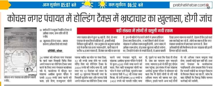 कोचस. नगर पंचायत में होल्डिंग टैक्स की वसूली में व्यापक पैमाने पर बरती गयी अनियमितता की जांच के लिए चार सदस्यीय टीम का गठन किया गया है. जो, लोगिकूफ टेक्नोलॉजी प्राइवेट लिमिटेड नामक एजेंसी के कर्मचारियों के इस अनियमित कार्य की जांच करेगी. कमेटी की जांच रिपोर्ट पर नगर प्रशासन कार्रवाई करेगा. इस संबंध में नगर कार्यपालक पदाधिकारी ओमप्रकाश सिंह ने बताया कि होल्डिंग टैक्स में हुई अनियमितता की निष्पक्ष जांच के लिए नगर कार्यपालक सहायक रवीश कुमार पाठक के नेतृत्व में चार सदस्यीय टीम का गठन किया गया है. कमेटी को जांच के लिए एक पखवारे का समय दिया गया है. उसे एक पखवारे के अंदर अपनी जांच रिपोर्ट नगर प्रशासन को सौंपने का निर्देश दिया गया है. जांच रिपोर्ट के आधार पर आगे की कार्रवाई की जायेगी. गौरतलब हो कि गत 16 दिसंबर के अंक में प्रभात खबर अखबार ने ‘कोचस नगर पंचायत में होल्डिंग टैक्स में भ्रष्टाचार का खुलासा, होगी जांच’ शीर्षक के साथ प्रमुखता से खबर प्रकाशित करने के बाद नगर प्रशासन हरकत में आया और मंगलवार को ही जांच कमेटी गठित कर दी. क्या हैं मामला गत 24 नवंबर को कोचस नगर पंचायत के वार्ड सात के निवासी विरेंद्र सिंह अपने मकान का होल्डिंग टैक्स जमा किया था. कार्यालय में कर संग्रहक अशोक कुमार पंडित ने उनसे 3200 रुपये लिये थे और 2004 रुपये का रसीद थमा दिया था. इसी तरह गत 12 दिसंबर को शहर के वार्ड 10 मुहल्ला शिवाजी नगर के निवासी सुदर्शन साह और शारदा देवी अपने-अपने मकान का होल्डिंग टैक्स दोनों मिलाकर कुल 6200 रुपये जमा किया था और उन्हें क्रमश: 2410 व 2450 रुपये की पावती रसीद थमा दी गयी थी. इसकी शिकायत पीड़ितों ने की, तो मामले का खुलासा हुआ. मामला डीएम तक पहुंचा, तो बवाल हो गया. इस कांड का खुलासा आपके अपने अखबार प्रभात खबर ने किया है. देखना है कि कंपनी के विरुद्ध कार्रवाई किस तरह की होती है. वसूली गई अधिक रकम की वापसी किस तरह होती है.