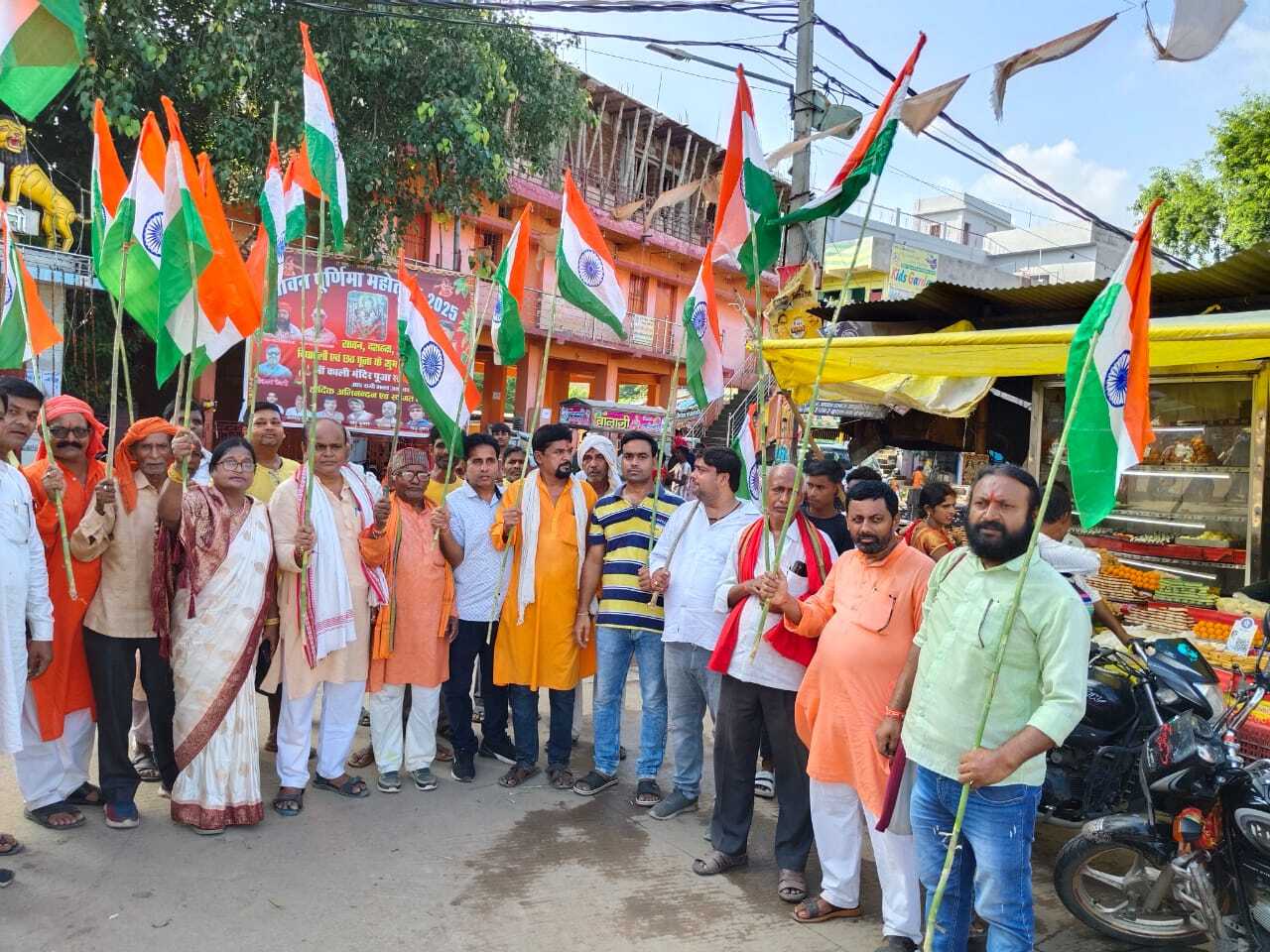 नोखा. नोखा में स्वतंत्रता दिवस पर हर घर तिरंगा फहराने के लिए बुधवार को भाजपा नगर अध्यक्ष मनोज चंदेल के नेतृत्व में कार्यकर्ताओं ने पैदल तिरंगा यात्रा निकाली. इस दौरान भाजपाइयों ने नारेबाजी करते हुए लोगों को झंडा फहराने के लिए प्रेरित किया. भाजपा कार्यकर्ताओं ने स्वतंत्रता दिवस से पूर्व तिरंगा यात्रा निकाली, तो लोगों ने भी स्वागत किया. यात्रा की शुरुआत पश्चिम पार्टी दुर्गा मंदिर से केशरवानी मोहल्ला हनुमानगढ़ी थाना मोड़, गोला रोड़ होते हुए बस स्टैंड काली मंदिर धर्मशाला में समापन हुआ. मौके पर भाजपा नेता उम्र शंकर प्रसाद शौडिक, अनिल सिंह, रमेश शर्मा मुखिया रमता यादव, तारानंद साह, अनुराग सिंह, राजू कसेरा, विकास सिंह, राजेश सिंह, पंकज किशोर पांडेय, सुनीता गुप्ता, अजय सिंह, रामप्रवेश, ललित राय, जितेंद्र सिंह सहित कई कार्यकर्ता मौजूद थे.