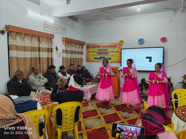 फोटो -24- प्रशिक्षण में भाग लेते सीबीएसई के शिक्षकगण प्रतिनिधि, तिलौथू. सरस्वती विद्या मंदिर में सीबीएसइ के नियमानुसार मान्यता प्राप्त विद्यालयों के शिक्षकों के लिए निर्धारित 50 घंटे के प्रशिक्षण कार्यक्रम की छह घंटे की एक कड़ी आयोजित की गयी. इस प्रशिक्षण के लिए सीबीएसइ ने दो संसाधन व्यक्तियों की नियुक्ति की थी.संसाधन व्यक्ति के रूप में उपांशु कुमार सिन्हा, प्राचार्य नारायण वर्ल्ड पब्लिक स्कूल सासाराम और सोनम मिश्रा, प्राचार्य मिशन स्कूल अरवल उपस्थित रहीं. दोनों ने दीप प्रज्वलित कर कार्यक्रम का उद्घाटन किया. विद्यालय के प्रधानाचार्य प्रमोद कुमार सिन्हा ने अंगवस्त्र, साहित्य एवं पुष्पगुच्छ देकर अतिथियों को सम्मानित किया. कार्यक्रम में विद्यालय प्रबंधकारिणी समिति के सचिव लाल बिहारी, अध्यक्ष सुमेर कुमार सिंह और कोषाध्यक्ष सत्येंद्र कुमार सिंह उपस्थित रहे. कार्यक्रम की शुरुआत सरस्वती वंदना से हुई, जबकि विद्यालय की बहनों ने स्वागत गीत प्रस्तुत किया. प्रशिक्षण के लिए विद्यालय को ‘तनाव प्रबंधन’ विषय निर्धारित किया गया था. संसाधन व्यक्तियों ने अपने वक्तव्य और विभिन्न गतिविधियों के माध्यम से बताया कि वर्तमान परिवेश में शिक्षक अत्यधिक तनाव में रहते हैं, जिससे कार्य प्रभावित होता है. तनाव मुक्त रहना आज के समय की आवश्यकता है. प्रशिक्षण में औरंगाबाद, रोहतास और अरवल जिलों से 60 प्रशिक्षार्थी शिक्षकों ने भाग लिया. प्रशिक्षकों ने कक्षा में बच्चों को तनाव से मुक्त रखने से संबंधित गतिविधियों का भी प्रदर्शन किया और शिक्षकों को व्यावहारिक उदाहरणों के माध्यम से विषय को समझाया. कार्यक्रम का संचालन विद्यालय की प्रतिभा कुमारी ने किया.