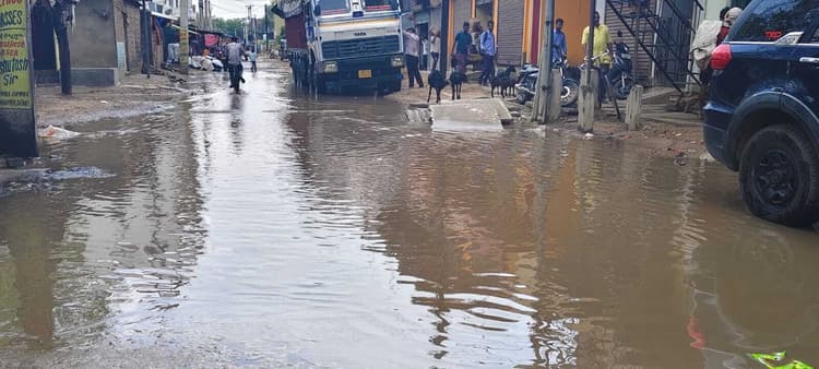 अधिकतर वार्डों में नाला उड़ाही का नगर पर्षद का था दावाफोटो -2- बारह पत्थर मुहल्ले में मुख्य सड़क पर हुआ जलजमाव.