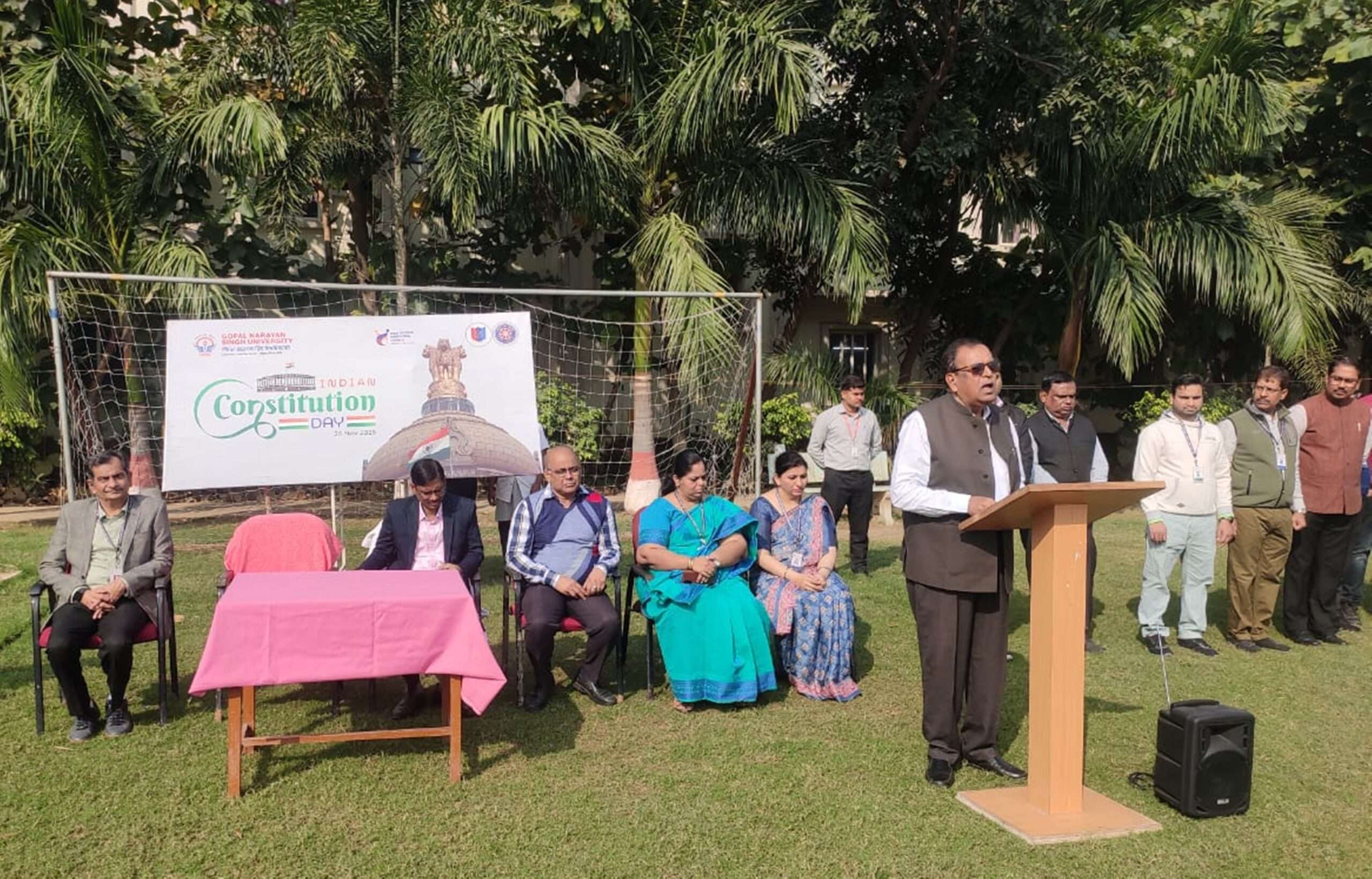 छात्रों को दिलाया कर्तव्यों के पालन का संकल्प फोटो-8- कार्यक्रम को संबोधित करते अतिथि व अन्य. प्रतिनिधि, सासाराम ऑफिस. गोपाल नारायण सिंह विश्वविद्यालय की एनसीसी और एनएसएस इकाई के संयुक्त तत्वावधान में संविधान दिवस पर विश्वविद्यालय परिसर में कार्यक्रम आयोजित हुआ. इस अवसर पर कुलपति प्रो डॉ जगदीश सिंह मुख्य वक्ता के रूप में उपस्थित रहे.उन्होंने छात्रों को संविधान की मूल भावना, सिद्धांतों और उसके व्यावहारिक महत्व पर विस्तार से मार्गदर्शन दिया. प्रो डॉ सिंह ने कहा कि भारतीय संविधान केवल देश की सर्वोच्च विधिक संरचना ही नहीं, बल्कि यह हमारी सामाजिक, सांस्कृतिक और प्रशासनिक व्यवस्था को सुदृढ़ और व्यवस्थित करने वाला आधार स्तंभ है. उन्होंने छात्रों से संविधान प्रदत्त अधिकारों एवं कर्तव्यों के प्रति सजग रहते हुए राष्ट्र निर्माण में सक्रिय भूमिका निभाने का आह्वान किया. कार्यक्रम में फैकल्टी ऑफ लॉ के डीन प्रो डॉ विनोद कुमार सरोज ने संविधान में निहित कानूनों व नियमों के प्रति छात्रों को जागरूक करते हुए निष्ठा, अनुशासन और देशभक्ति के साथ संविधान पालन का संकल्प दिलाया. कार्यक्रम का संचालन और संयोजन डॉ मयंक कुमार राय ने किया.