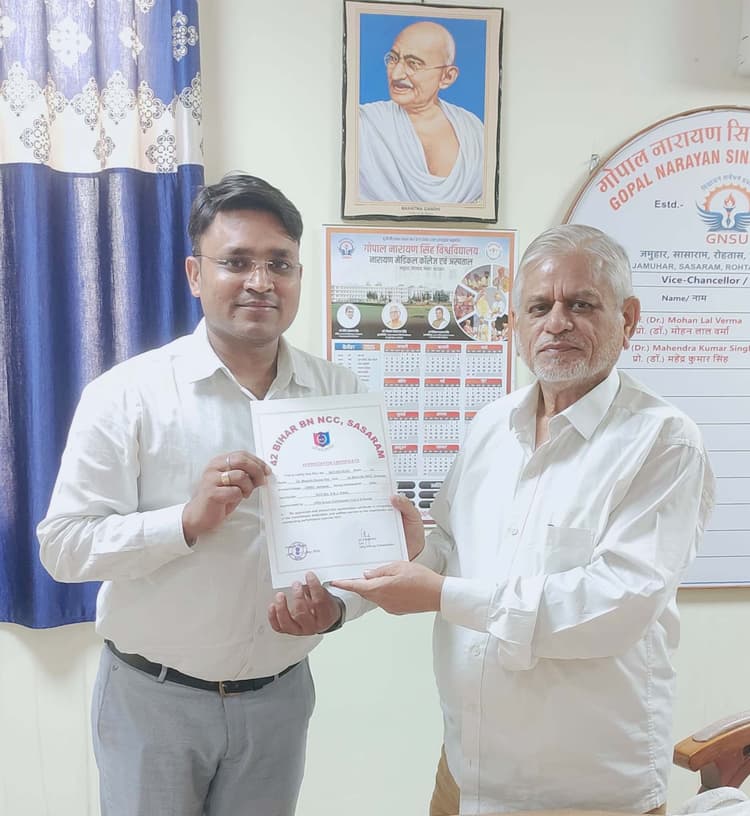 उत्कृष्ट सेवाओं के लिए ग्रुप हेडक्वार्टर ने प्रशस्ति पत्र देकर किया सम्मानित फोटो-6- प्रशस्ति पत्र प्राप्त करते एनसीसी अधिकारी. प्रतिनिधि, सासाराम ऑफिस गोपाल नारायण सिंह विश्वविद्यालय जमुहार के एनसीसी अधिकारी लेफ्टिनेंट डॉ मयंक कुमार राय को उनकी उत्कृष्ट सेवाओं व अनुकरणीय कार्यों के लिए ग्रुप हेडक्वार्टर के डिप्टी ग्रुप कमांडर कर्नल जीएस नंदा द्वारा प्रशस्ति पत्र प्रदान कर सम्मानित किया गया. इस अवसर पर 42 बिहार बटालियन सासाराम के कमांडिंग ऑफिसर कर्नल धर्मेंद्र सिंह मलिक ने भी डॉ मयंक के योगदान की सराहना करते हुए उनके कार्यों की जमकर तारीफ की. विश्वविद्यालय के कुलपति डॉ महेन्द्र कुमार सिंह ने डॉ मयंक को बधाई देते हुए कहा कि यह विश्वविद्यालय के लिए गर्व की बात है. कुलपति ने कहा कि इस तरह का सम्मान हमारे लिए प्रेरणा है. उन्होंने एनसीसी इकाई के प्रति आभार प्रकट करते हुए विश्वास जताया कि एनसीसी कैडेट्स भविष्य में राष्ट्र निर्माण में अहम भूमिका निभायेंगे. इसी क्रम में विश्वविद्यालय परिसर में एनसीसी कैडेट्स के साथ युद्धकालीन सावधानियों को लेकर मॉक ड्रिल का आयोजन हुआ. यह मॉक ड्रिल भारत सरकार के दिशा-निर्देशों के अंतर्गत हुई, जिसमें 42 बिहार बटालियन के कमांडिंग ऑफिसर कर्नल धर्मेंद्र सिंह मलिक ने कैडेट्स को कई अहम पहलुओं की जानकारी दी. कार्यक्रम में प्रशिक्षक रौशन सिंह, सीनियर अंडर ऑफिसर पुरुषोत्तम, अंडर ऑफिसर सुमंत, सभी एनसीसी कैडेट्स सहित अन्य लोग भी उपस्थित रहे.