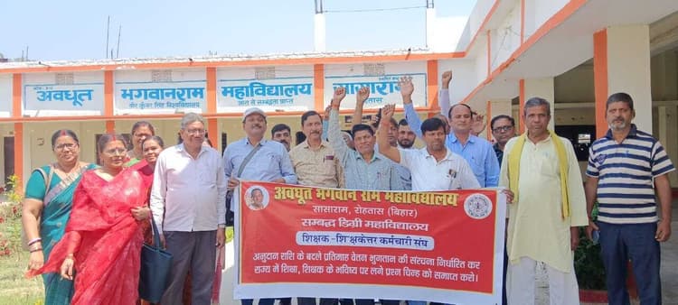 सासाराम ऑफिस. बिहार राज्य संबद्ध डिग्री महाविद्यालय शिक्षक-शिक्षकेत्तर कर्मचारी महासंघ (फैक्टनेब) के आह्वान पर अवधूत भगवान राम महाविद्यालय के शिक्षक-शिक्षकेतर कर्मचारियों ने मंगलवार को विरोध मार्च किया. विरोध मार्च को संबोधित करते हुए कॉलेज के प्राचार्य डॉ विनोद कुमार सिंह ने कहा कि कहा कि बिहार राज्य विश्वविद्यालय अधिनियम 1976 में संशोधन करके बिहार कॉलेज सेवा आयोग की जगह नयी संस्था चयन समिति का प्रावधान किया गया है. इसके तहत संबद्ध डिग्री कॉलेजों में प्राचार्य व शिक्षकों की नियुक्ति यूजीसी मानक के अनुरूप चयन समिति से की जा रही है. परंतु, राज्य सरकार द्वारा यूजीसी मानक के अनुरूप पदनाम व प्रतिमाह वेतन संरचना निर्धारित कर मासिक वेतन का भुगतान नहीं किये जाने से शिक्षकों के समक्ष आर्थिक समस्या उत्पन्न हो गयी है. मांगों और विरोध में महासंघ के आह्वान पर कॉलेज के शिक्षक व शिक्षकेतर कर्मचारी आगामी 27 मार्च को पटना में सामूहिक उपवास/ काला दिवस कार्यक्रम में शामिल होंगे. एकमुश्त राशि शिक्षाकर्मियों के बैंक खाते में भुगतान करने की मांग: कॉलेज के शिक्षक प्रतिनिधि अनिल कुमार सिंह ने कहा कि वेतन संरचना निर्धारित करते हुए प्रतिमाह वेतन भुगतान, लंबित अनुदान राशि का बजटीय उपबंध सुनिश्चित कर एकमुश्त राशि शिक्षाकर्मियों के बैंक खाते में भुगतान किया जाए. कॉलेज के बर्सर सह मनोविज्ञान विभाग के सहायक प्रोफेसर बबन सिंह ने कहा कि बढ़ती महंगाई के मद्देनजर 2008 में निर्धारित राशि को बढ़ाकर स्नातक प्रथम, द्वितीय व तृतीय खण्ड में उत्तीर्ण होने वाले छात्रों की वास्तविक संख्या के गणना के आधार पर प्रत्येक खंड के लिए मिलने वाली राशि में तीन गुना वृद्धि करनी चाहिए. इतिहास विभाग के सहायक प्रो नंद गोपाल सिंह ने कहा कि 2008 के संकल्प का अनुपालन करते हुए परीक्षा परिणाम आधारित वेतनमान सहायक अनुदान राशि स्नातक खंड के लिए डेढ़ करोड़ रुपये और इंटर खंड के लिए 50 लाख रुपये की अधिकतम सीमा के बंधेज को समाप्त करने की मांग की. उपयोगिता प्रमाणपत्र जमा करने के नाम पर भ्रष्टाचार का खेल बंद हो: डॉ रेनू बाला ने कहा कि उपयोगिता प्रमाणपत्र जमा करने के नाम पर भ्रष्टाचार का खेल बंद होना चाहिए. समाजशास्त्र विभाग की सहायक प्रोफेसर डॉ देवमुनि कुमारी ने कहा कि संबद्ध डिग्री कॉलेजों में कार्यरत लगभग 25 हजार शिक्षाकर्मियों का शैक्षणिक सत्र 2014-17 से शैक्षणिक सत्र 2021-24 तक कुल आठ सत्र का परीक्षा परिणाम आधारित वेतनमद सहायक अनुदान राशि राज्य सरकार के संकल्प 2008 के आधार पर सरकार के पास बकाया है. महाविद्यालय के परीक्षा नियंत्रक जंतु विज्ञान विभाग के सहायक प्रो डॉ सुनील कुमार ने कहा कि लगभग 70 प्रतिशत शिक्षार्थियों की जिम्मेदारी निभाने 