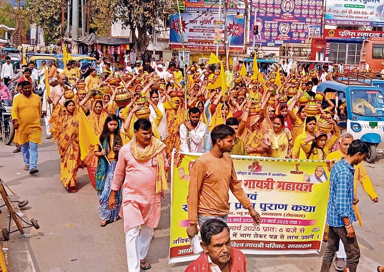सासाराम ग्रामीण. शहर के न्यू एरिया स्थित मां गायत्री शक्तिपीठ में रविवार से नौ कुंडीय गायत्री महायज्ञ का शुभारंभ हुआ. यज्ञ का आरंभ करने से पूर्व कलशयात्रा निकाली गयी. कलशयात्रा गायत्री शक्ति पीठ से घोड़ा, बैंड-बाजे के साथ निकली. इसके बाद बौलिया रोड, धर्मशाला चौक, पोस्ट ऑफिस चौक होते हुए कुराइच महावीर स्थान पहुंची. जहां पुरोहितों ने वैदिक मंत्रोच्चार के साथ जलभरी करायी गयी. फिर माथे पर कलश लिये पीले वस्त्र धारण किये श्रद्धालु मंत्रों का जाप कर रहे थे. कलशयात्रा पोस्ट ऑफिस चौक होती हुई यज्ञ मंडप पहुंची. वहां शांतिकुंज हरिद्वार से आयी संतों की टोली ने वेद मंत्रों के उच्चारण के साथ पूजन कराया. इसके बाद सायंकालीन सत्र में टोली द्वारा संगीत प्रवचन का आयोजन हुआ, जिसमें बड़ी संख्या में परिजनों ने भाग लिया. गायत्री परिवार की पुस्तकों एवं विभिन्न धार्मिक पूजन के सामान से यज्ञ स्थल पर मेले जैसा माहौल चल रहा है. कलशयात्रा में मुख्य ट्रस्टी राजकुमारी चौहान, अतेंद्र कुमार सिंह, वीरेंद्र कुमार त्रिपाठी, विमल सिंह अशोक सिंह, नगर निगम के वार्ड 17 की पार्षद सुकांति सिंह, पुरुषोत्तम सिंह, उर्मिला देवी, उमेश सिंह व किरण देवी आदि शामिल थे.
