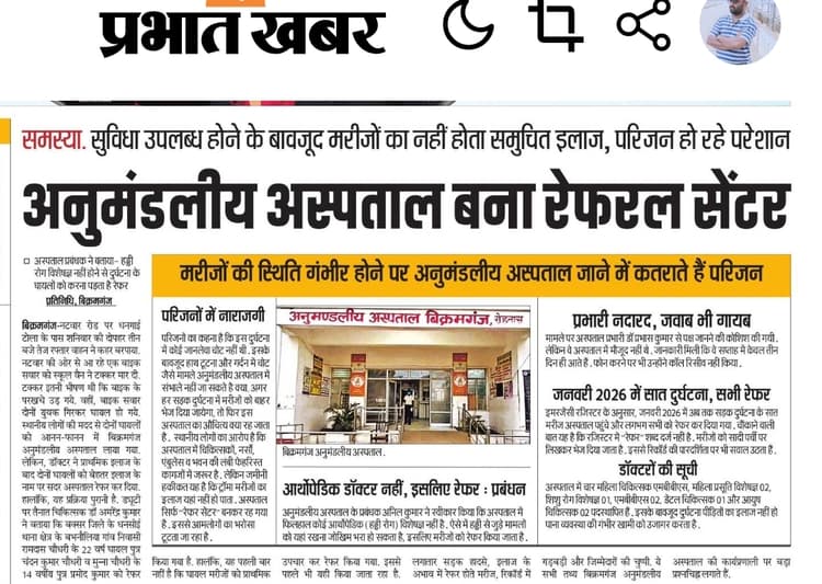 प्रभात खबर में 19 जनवरी को प्रकाशित खबर में अनुमंडलीय अस्पताल बिक्रमगंज की कार्यप्रणाली पर सवाल उठने के बाद अस्पताल प्रशासन हरकत में आ गया है. प्रशासन ने 21 जनवरी 2026 से चिकित्सा पदाधिकारियों का नया ड्यूटी रोस्टर लागू कर दिया है. इसके तहत रविवार और सोमवार को ओपीडी, इमरजेंसी और नाइट ड्यूटी के लिए चिकित्सकों की स्पष्ट तैनाती की गयी है, ताकि मरीजों को बेहतर और समय पर इलाज मिल सके. ज्ञात हो कि 18 जनवरी को बिक्रमगंज-नटवार रोड पर धनगाई टोले के पास हुए सड़क हादसे में घायल दो युवकों को अनुमंडलीय अस्पताल लाया गया था. लेकिन, प्राथमिक औपचारिकता के बाद उन्हें सासाराम रेफर कर दिया गया. रिपोर्ट में सवाल उठाया गया था कि हाथ टूटने और गर्दन में चोट जैसे मामलों को भी यदि बाहर भेजा जायेगा, तो अनुमंडलीय अस्पताल की उपयोगिता क्या रह जायेगी. अखबार में यह भी उजागर किया गया था कि जनवरी 2026 में ही सड़क दुर्घटना के सात मरीज अस्पताल पहुंचे, जिनमें से लगभग सभी को रेफर कर दिया गया, जबकि रजिस्टर में इसका स्पष्ट उल्लेख तक नहीं है. अस्पताल प्रबंधन ने आर्थोपेडिक चिकित्सक की कमी को मजबूरी बताया था. खबर प्रकाशित होने के बाद जारी किया गया नया रोस्टर प्रशासन की त्वरित प्रतिक्रिया माना जा रहा है. इससे मरीजों को समुचित इलाज होगा. इससे दूसरे जगह जाने से होने वाले खर्च और समय की बचत होगी.इमरजेंसी सेवा 24 घंटे उपलब्ध रहेगी