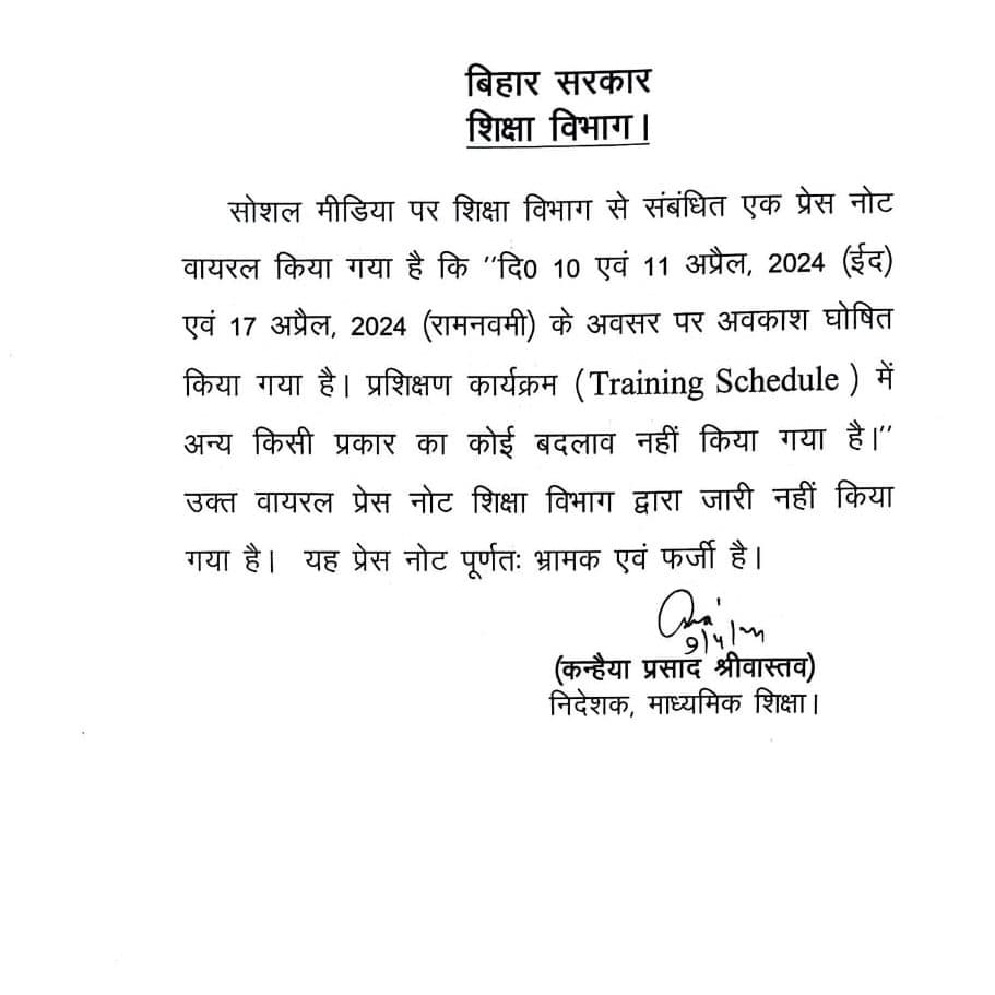 वहीं, इससे पहले मंगलवार को माध्यमिक शिक्षा निदेशक ने उस प्रेस नोट को फर्जी बताया है, जिसमें 10 और 11 अप्रैल को ईद और 17 अप्रैल को रामनवमी की छुट्टी घोषित की गयी थी. माध्यमिक शिक्षा निदेशक ने एक्स हैंडल पर एक पत्र शेयर किया. जिसमें कहा गया है कि सोशल मीडिया पर वायरल प्रेस नोट पूरी तरह फर्जी एवं भ्रामक है. लिहाजा विभाग की तरफ से शिक्षकों के प्रशिक्षण कार्यक्रम में किसी भी प्रकार का बदलाव नहीं किया गया है.