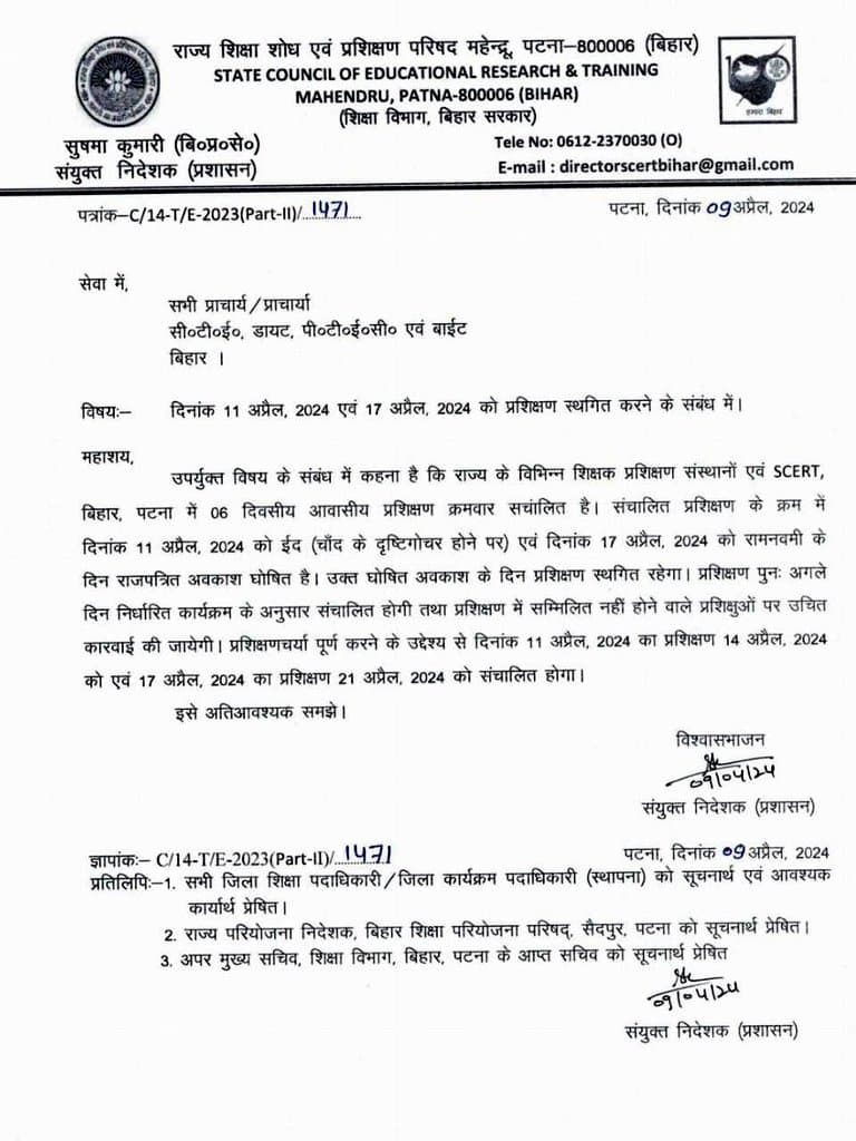 SCERT द्वारा राज्य के सभी सरकारी प्रशिक्षण संस्थाओं के प्राचार्य को लिखे गए पत्र में बताया गया है कि अब 11 अप्रैल को होने वाली ट्रेनिंग14 अप्रैल को होगी. वहीं 17 अप्रैल को रामनवमी पर होने वाला प्रशिक्षण 21 अप्रैल को कराया जाएगा. SCERT ने ईद और रामनवमी को लेकर 11 और 17 अप्रैल को अवकाश घोषित कर दिया है.