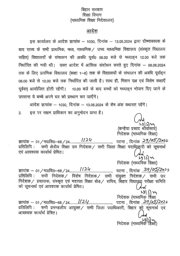 जारी पत्र के मुताबिक सभी स्कूलों में सुबह छह बजे से दस बजे तक कक्षाओं का संचालन होगा. दस बजे के बाद बच्चों को मध्याह्न भोजन दिया जाएगा. जिसके बाद बच्चे अपने घर जा सकेंगे. साथ ही मिशन दक्ष और विशेष कक्षाएं पहले की तरह ही आयोजित की जाएंगी. इसमें किसी तरह की राहत नहीं दी गई है. यह आदेश माध्यमिक शिक्षा निदेशक द्वारा आठ जून तक के लिए जारी किया गया है.