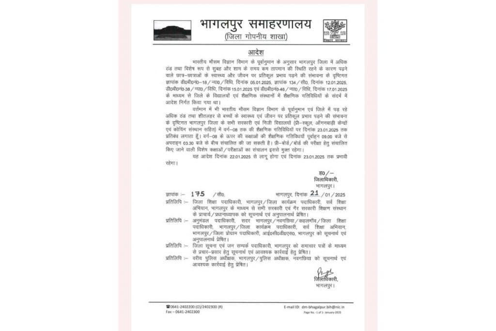 जिलाधिकारी भागलपुर की तरफ से जारी किए गए आदेश में कहा गया है कि भारतीय मौसम विज्ञान विभाग के पूर्वानुमान एवं जिले में पड़ रहे अधिक ठंड तथा शीतलहर से बच्चों के स्वास्थ्य एवं जीवन पर प्रतिकूल प्रभाव पड़ने की संभावना के दृष्टिगत भागलपुर जिला के सभी सरकारी एवं निजी विद्यालयों (प्री-स्कूल, आँगनबाड़ी केन्द्रों एवं कोचिंग संस्थान सहित) में वर्ग-08 तक की शैक्षणिक गतिविधियों पर दिनांक 23.01.2025 तक प्रतिबंध लगाता हूं. कक्षा 8 के ऊपर की कक्षाओं की शैक्षणिक गतिविधयां पूर्वाह्न 09.00 बजे से अपराह्न 03.30 बजे के बीच संचालित की जा सकती है. प्री-बोर्ड / बोर्ड की परीक्षा हेतु संचालित किए जाने वाली विशेष कक्षाओं / परीक्षाओं का संचालन इससे मुक्त रहेगा.यह आदेश दिनांक 22.01.2025 से लागू होगा एवं दिनांक 23.01.2025 तक प्रभावी रहेगा.