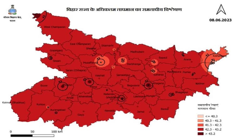 आइएमडी पटना की आधिकारिक जानकारी के अनुसार प्रचंड गर्मी की वजह से पूर्णिया का पारा ऑल टाइम रिकॉर्ड के पार चल रहा है. यहां का तापमान 43.2 डिग्री सेल्सियस रहा. फिलहाल पूरे बिहार में भीषण लू चली. राज्य की एक-दो जगह को छोड़ दें तो आइएमडी ने बिहार के भूगौलिक मैप को गुरुवार को लाल और गहरे लाल रंग से दिखाया है. जानकारों के मुताबिक इसका आशय यह रहा कि प्रदेश का औसत उच्चतम तापमान कमोबेश 42 डिग्री या इससे ऊपर पहुंच गया है.