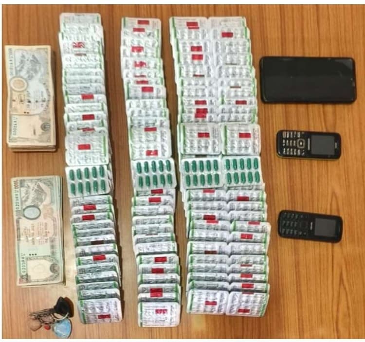 बैरगनिया/रौतहट(नेपाल). नेपाल के रौतहट जिले के परोहा नगरपालिका अंतर्गत बशीर चौक के समीप प्रहरी ने मंगलवार को भारी मात्रा में प्रतिबंधित नशीली दवाओं के साथ दो तस्कर को गिरफ्तार कर लिया. गिरफ्तार तस्करों की पहचान नेपाल के बारा जिले के निजगढ़ नगरपालिका वार्ड नंबर-7 निवासी शिखर बहादुर (30 वर्ष) एवं पूर्वी चंपारण जिले के घोड़ासहन थाना क्षेत्र के कबैया निवासी गोलू उर्फ नैतिक कुमार (29 वर्ष) के रूप में की गयी है. डीएसपी सह पुलिस प्रवक्ता विष्णु प्रदीप वस्याल ने मीडिया को बताया कि सुबह को गुप्त सूचना मिली थी भारतीय क्षेत्र से भारी मात्रा में प्रतिबंधित दवाएं तस्करी कर नेपाल ले जाने की योजना है. तस्करों को पकड़ने के लिए प्रहरी चौकी सरमुजवा व मोतीपुर नरकटिया के प्रहरी द्वारा संयुक्त जांच अभियान चलाया गया था. जांच के क्रम में एक बाइक (बीआर 05 बीएल 8846) पर सवार दो व्यक्ति को भारतीय क्षेत्र से नेपाल में प्रवेश करने पर जांच के क्रम में उसके बाइक के डिक्की से ट्रामोल-50 का 126 पीस टेबलेट व 1260 पीस कैप्सुल सहित तीन मोबाइल तथा 36 हजार नगद राशि बरामद की गयी. गिरफ्तार तस्करों को रौतहट जिला प्रहरी कार्यालय में रखकर पूछताछ की जा रही है.