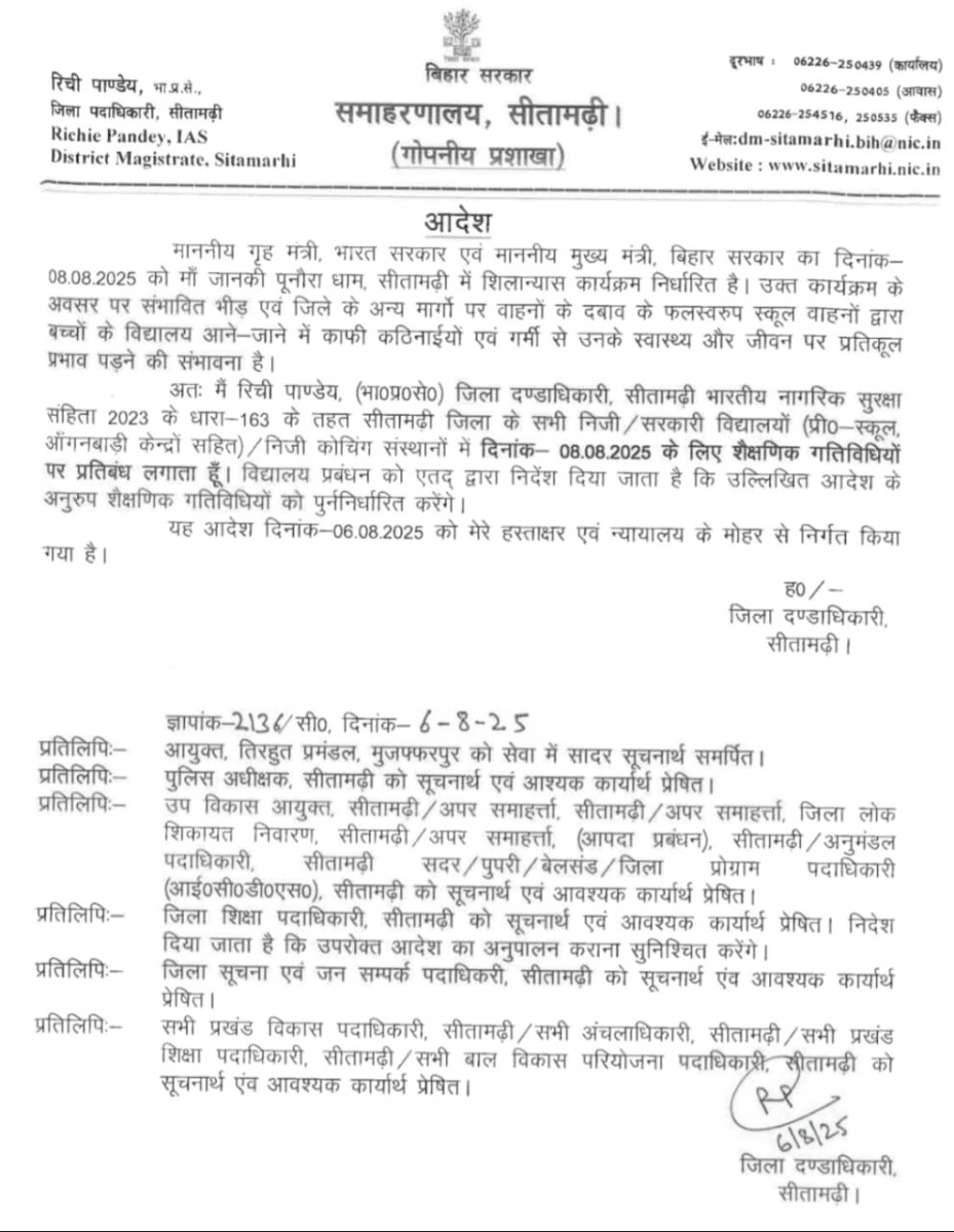 Bihar School Closed: सीतामढ़ी जिला प्रशासन ने 8 अगस्त 2025 (गुरुवार) को जिले के सभी निजी एवं सरकारी विद्यालयों में शैक्षणिक गतिविधियों पर रोक लगा दी है. यह आदेश जिलाधिकारी ऋचा पांडेय द्वारा जारी किया गया है. आदेश में कहा गया है कि 8 अगस्त को केंद्रीय गृह मंत्री अमित शाह और बिहार के मुख्यमंत्री नीतीश कुमार के द्वारा पुनौरा धाम में शिलान्यास कार्यक्रम का आयोजन किया गया है. इस अवसर पर भारी भीड़ की संभावना है, जिससे बच्चों के विद्यालय आने-जाने में कठिनाई हो सकती है.