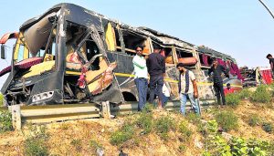 सीवान शहर के ललित बस स्टैंड से दिल्ली को जाने वाली कृष्णा ट्रेवल्स की बस यूपी के कन्नौज में पलट गयी. इस हादसे में जहां दो यात्रियों की मौत हो गयी, वहीं 30 यात्री घायल हो गये. बुधवार की दोपहर तकरीबन 2:05 बजे बस स्टैंड से उक्त बस यात्रियों को लेकर निकली. बस सीवान से मीरगंज, गोपालगंज, गोरखपुर, लखनऊ, आगरा, मथुरा नोएडा 37, आनंद विहार होते हुए दिल्ली तक जाती है. बस जैसे ही कन्नौज के समीप ठठिया थाना क्षेत्र के किलोमीटर संख्या 205 के नजदीक पहुंची कि बस के आगे चल रहा मक्का लोड ट्रैक्टर पलट गया. पीछे से आ रही कृष्णा ट्रेवल्स बस मक्के के बोरे पर चढ़ कर अनियंत्रित हो गयी. फिर बस डिवाइडर की दूसरी साइड जाकर पलट गयी. इस हादसे के बाद वहां अफरा-तफरी मच गयी. मौके पर पहुंची यूपी पुलिस ने दोनों शवों को कब्जे में ले लिया तथा सभी घायलों को अस्पताल पहुंचाया. जो लोग सुरक्षित थे, उन्हें अन्य गाड़ियों से घर भिजवाया गया. घायलों में एक दर्जन यात्री गोपालगंज के बताये जा रहे हैं. दोनों मृत यात्रियों की पहचान नहीं हो सकी है. इधर, पूछताछ के बाद पुलिस ने इसकी सूचना घायलों के परिजनों को दी. पंचदेवरी के नेहरुआ गांव निवासी राधेश्याम शर्मा व भठवां गांव के भोलू पांडेय ने लखनऊ से घटनास्थल पर पहुंच कर घायलों की मदद की. घायलों के परिजनों से फोन से संपर्क कर स्थिति से अवगत भी कराया. इन लोगों ने बताया कि हादसे में अन्य जिलों के भी कई यात्री घायल हुए हैं. यूपी पुलिस जांच में जुटी हुई है. ललित बस स्टैंड में कृष्ण ट्रैवल्स बस का बुकिंग काउंटर चलता है, जहां लोग बॉर्डर पर अंकित नंबर के माध्यम से बुकिंग करते हैं और बस में सवार यात्रियों का फोन नहीं लगता है तो बुकिंग नंबर के माध्यम से स्थिति की जानकारी लेते हैं, लेकिन जैसे ही बस दुर्घटनाग्रस्त हुई कि बोर्ड पर अंकित बुकिंग नंबर भी बंद आने लगा. यहां तक बुकिंग काउंटर छोड़ कर भी कर्मी फरार हो गये. घटना के बाद स्थिति की जानकारी लेने के लिए कई लोग बुकिंग काउंटर पर पहुंचे, लेकिन बुकिंग काउंटर खाली रहने के कारण लोग वापस लौट गये.