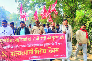 सीवान. भाकपा माले के जिला सचिव हंसनाथ राम ने कहा कि बिहार में पुनः भाजपा-जदयू के सत्ता में आने के बाद गरीब, मजदूर और फुटपाथी दुकानदारों के खिलाफ बुलडोजर अभियान तेज हो गया है. गरीब जनता को 10 हजार रुपये के लालच में वोट देकर ठगा महसूस कर रही है. एक तरफ अतिक्रमण के नाम पर गरीबों को उजाड़ा जा रहा है, तो वहीं बड़े भू-स्वामी फर्जी दस्तावेज या जबरन कब्जा की गई जमीन पर मजबूत पकड़ बनाये हुए हैं. हंसनाथ राम ने बताया कि महंगाई के इस दौर में भागलपुर में एक रुपये प्रति एकड़ की दर से 1050 एकड़ जमीन अडानी को दी गयी है, जिससे लाखों पेड़ों का नुकसान हो रहा है और गरीब बेदखल हो रहे हैं. उन्होंने बताया कि जिला में राम जानकी पथ निर्माण में किसानों की जमीन औने-पौने दाम पर ली जा रही है, जबकि कानून के मुताबिक ऐसे रोड निर्माण में बाजार मूल्य से चार गुना अधिक कीमत देना अनिवार्य है. पूर्व विधायक अमरनाथ यादव ने कहा कि जनता को ठग कर सत्ता में आने के बाद यह अन्याय बर्दाश्त नहीं किया जायेगा. भाकपा माले ने राज्यव्यापी कार्यक्रम के तहत जिला में प्रतिवाद मार्च निकालकर मांग की कि गरीब और फुटपाथी दुकानदारों को बुलडोजर के बजाय रोजी-रोटी और जीवन यापन की सुरक्षा प्रदान की जाये. मार्च में नेतृत्व भाकपा माले जिला सचिव हंसनाथ राम, मैरवा प्रखंड सचिव मुकेश कुशवाहा, नगर निकाय सफाई मजदूर नेता अमित शाह, जिला कमेटी सदस्य विकास यादव, गौतम पांडे, छात्र नेता प्रिंस पासवान, अनीश, सुनील, कालू और प्रदीप सहित अन्य नेता उपस्थित थे. नेताओं ने कहा कि गरीबों से गद्दारी और अमीरों से यारी पर रोक लगायी जानी चाहिए तथा न्यायपूर्ण व्यवस्था सुनिश्चित की जाये. इस दौरान जनता में विरोध और अन्याय के खिलाफ गहरी नाराजगी देखने को मिली.