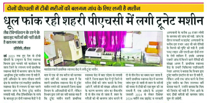 सीवान. 28 अप्रैल के अंक में प्रभात खबर में धूल फांक रहा है शहरी पीएचसी में लगी ट्रूनेट मशीन शीर्षक से खबर के प्रमुखता से छपने के बाद स्वास्थ्य विभाग के अधिकारियों ने मामले को गंभीरता से लिया एवं ट्रूनेट मशीन को चिप उपलब्ध कराया और दोनों स्वास्थ्य केंद्रों में टीबी की बलगम जांच शुरू कर दी गयी. जिला यक्ष्मा केंद्र के प्रयोगशाला प्रौद्योगिकी ओमप्रकाश ने दिनों स्वास्थ्य केंद्र के एलटी को प्रशिक्षण देकर बलगम जांच शुरू करायी. बलगम जांच शुरू होने के बाद सीवान शहरी क्षेत्र के मरीजों को काफी राहत मिली है. 2025 तक हुए देश से टीबी बीमारी के उन्मूलन के लिए स्वास्थ्य विभाग द्वारा चलाए गए कार्यक्रम के तहत जिले के लगभग सभी प्राथमिक स्वास्थ्य केंद्रों में बलगम जांच के लिए आधुनिक ट्रूनेट मशीन लगा दी गयी है. इसी अभियान के तहत सीवान शहरी क्षेत्र के महादेवा एवं लक्ष्मीपुर प्राथमिक स्वास्थ्य केंद्र में लगभग तीन माह पहले बलगम जांच के लिए ट्रूनेट मशीन लगाई गयी है. लैब टेक्नीशियन के रहने के बावजूद इन दोनों स्वास्थ्य केंद्रों ने ट्रेन माह में एक भी तब मरीज का बलगम जांच नहीं की गयी. यहां तक प्राथमिक स्वास्थ्य केंद्र में ट्रूनेट मशीन लगने की जानकारी जिला यक्ष्मा विभाग के अधिकारियों को भी नहीं थी. समाचार छपने के बाद स्वास्थ्य विभाग के अधिकारियों ने मामले को संज्ञान में लिया तथा बीएमएसआइसीएल से ट्रूनेट मशीन की चिप एवं जांच के लिए केमिकल मंगाया. सभी आवश्यक सामान उपलब्ध होने के बाद गुरुवार से दिनों शहरी प्राथमिक स्वास्थ्य केंद्रों में टीबी बीमारी की ट्रूनेट मशीन से बलगम जांच शुरू कर दी गई.क्या कहते हैं जिम्मेदार