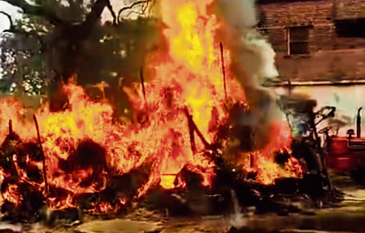 सिसवन. प्रखंड के नवलपुर गांव के समीप गुरूवार की शाम हाई वोल्टेज बिजली की तार के चपेट में आने से गेहूं का बोझ सहित ट्रैक्टर गाड़ी जलकर खाक हो गया. हालांकि इस दुर्घटना में ट्रैक्टर का चालक बाल-बाल बचा गया. मिली जानकारी के अनुसार गुरूवार की शाम नवलपुर गांव निवासी मनोज शर्मा ट्रैक्टर से स्थानीय निवासी सावलिया यादव के खेत से गेहूं का बोझ लादकर खलिहान में ले जा रहा था. इसी बीच गांव के ही चंवर में गुजर रही हाई वोल्टेज बिजली की तार को गेहूं का बोझ छू गया और बोझ में अचानक आग लग गई. गेहूं के बोझ में आग लगते ही ट्रैक्टर चालक गाड़ी से कूदकर दूर भाग गया, और जबतक कुछ समझ पाता गेहूं के करीब 80 से 90 बोझा के साथ ही ट्रैक्टर भी धू-धूकर जलने लगा. ट्रैक्टर में आग लगने की सूचना पर ग्रामीणों की भीड़ जमा हो गई. इस बीच घटना की सूचना फायर बिग्रेड के अधिकारियों को भी दी गई लेकिन, जबतक आग को काबू में किया जाता. गेहूं की बोझ के साथ ट्रैक्टर भी जलकर खाक हो गया. हालांकि, घटना के बाद लोगों में बिजली विभाग के कर्मियों के खिलाफ गुस्सा है. ग्रामीणों का कहना था कि घटना स्थल के समीप बिजली का तार काफी नीचे है. इसकी जानकारी भी कई बार बिजली विभाग कर्मियों को दी गई थी. लेकिन, किसी ने इसमें सुधार करना जरूरी नहीं समझा, और इतना बड़ा घटना हो गया.