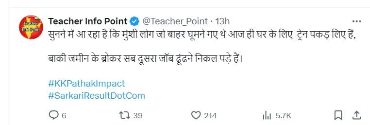 सोशल मीडिया पर एक यूजर ने चुटकी लेते हुए लिखा कि जमीन के ब्रोकर सब अब दूसरा जॉब ढूंढने निकल पड़े हैं. सुनने में आ रहा है कि मुंशी लोग जो बाहर घूमने गए थे वो आज ही घर के लिए ट्रेन पकड़ लिए हैं. ऐसी कई प्रतिक्रियाएं लोग के के पाठक के तबादले को लेकर कर रहे हैं.