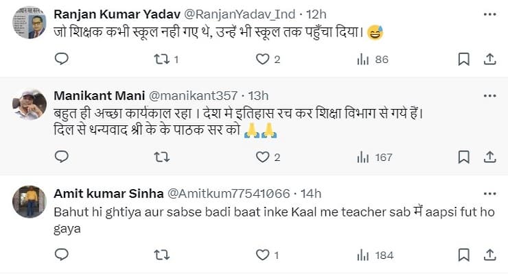 के के पाठक को लेकर एक यूजर ने सोशल मीडिया X पर लिखा कि जो शिक्षक स्कूल नहीं जाते थे उन्हें भी स्कूल पहुंचा दिया. तो किसी ने लिखा कि शिक्षकों में इनके कारण आपसी फूट पड़ गयी. मणिकांत लिखते हैं कि वो देश में इतिहास रचकर इस विभाग से गए हैं.